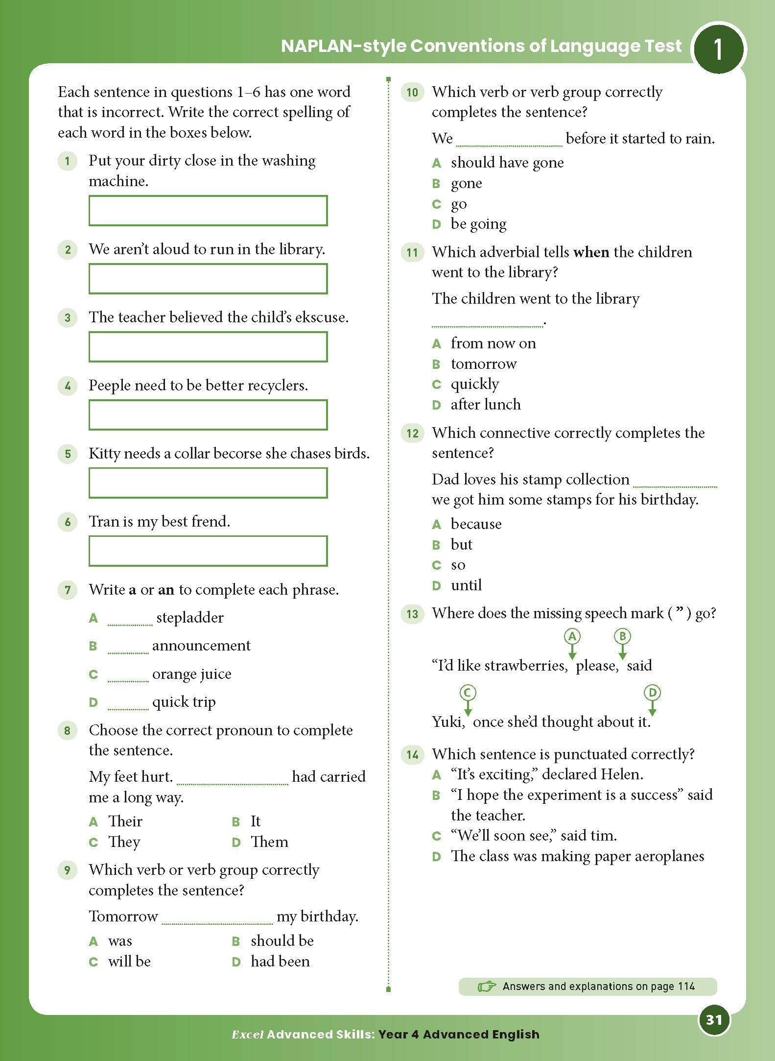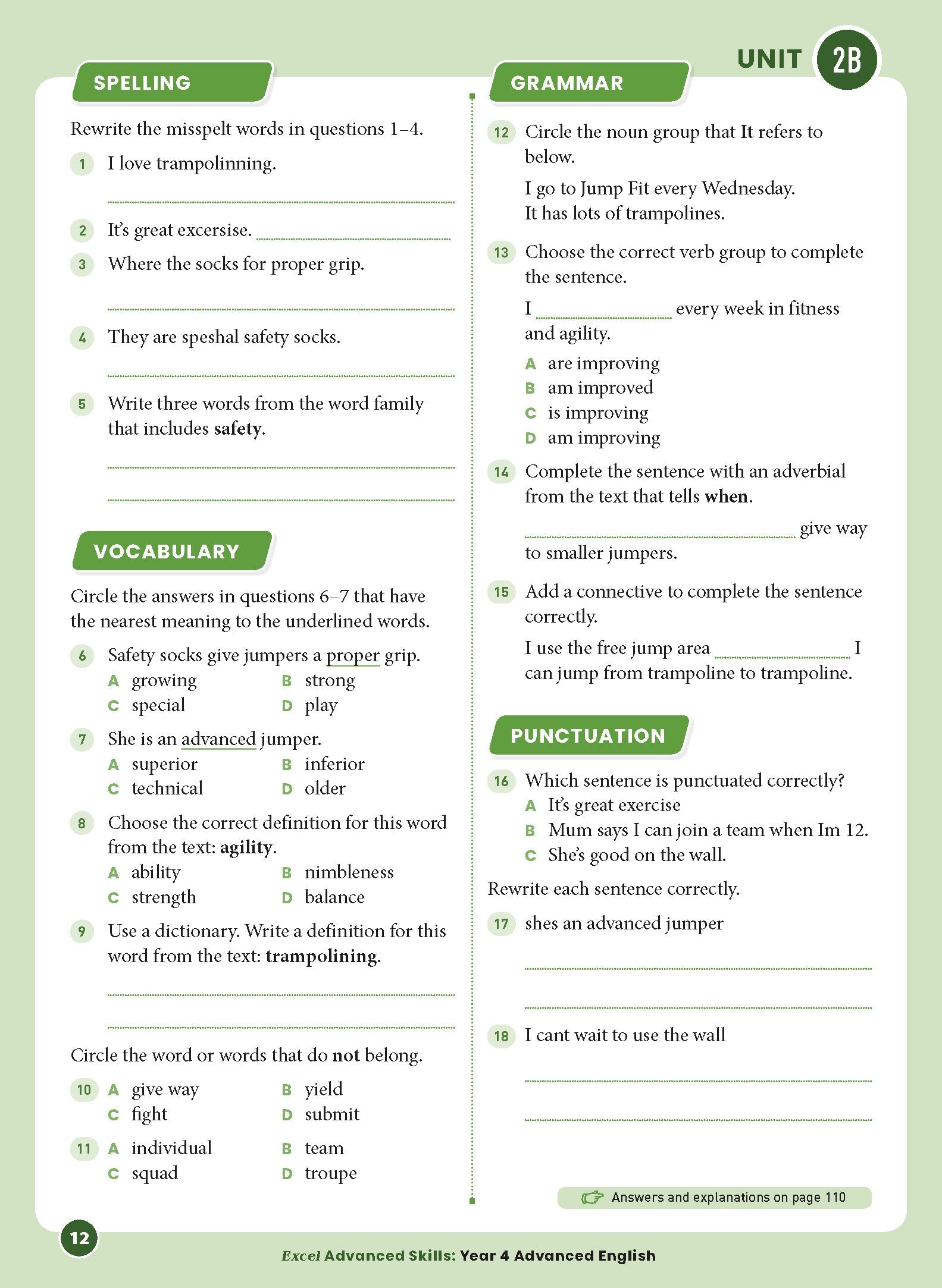• Spelling and vocabulary questions with a focus on advanced work covering topics such as misspelt words, word families, synonyms, definitions and antonyms