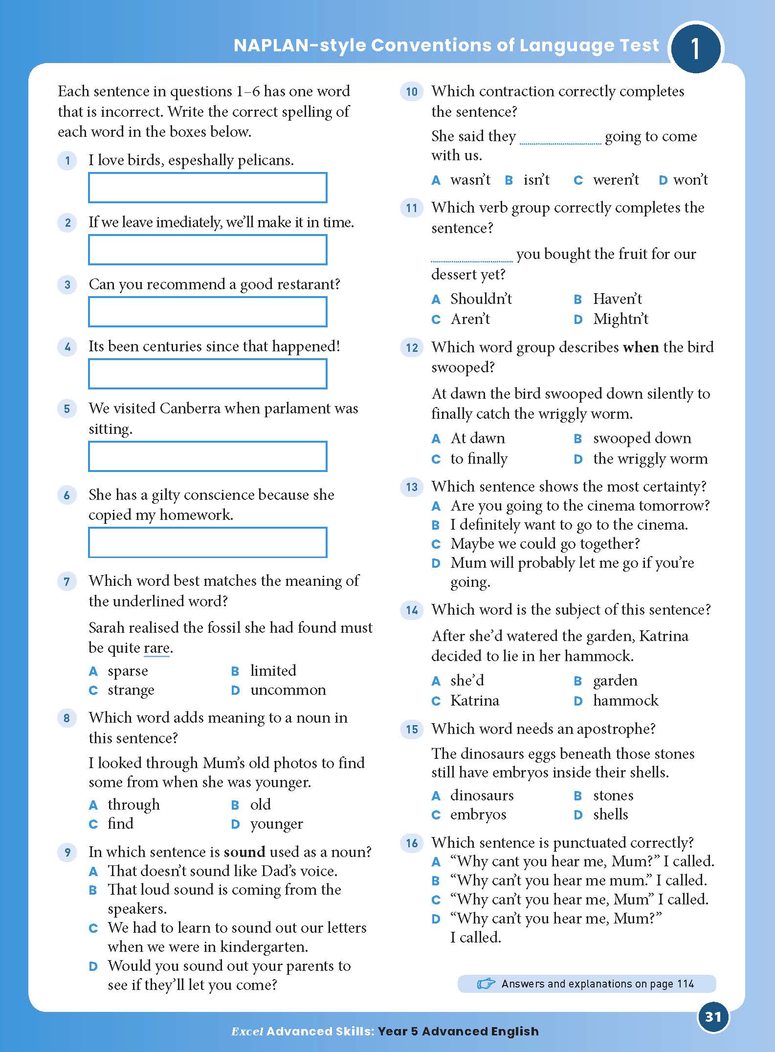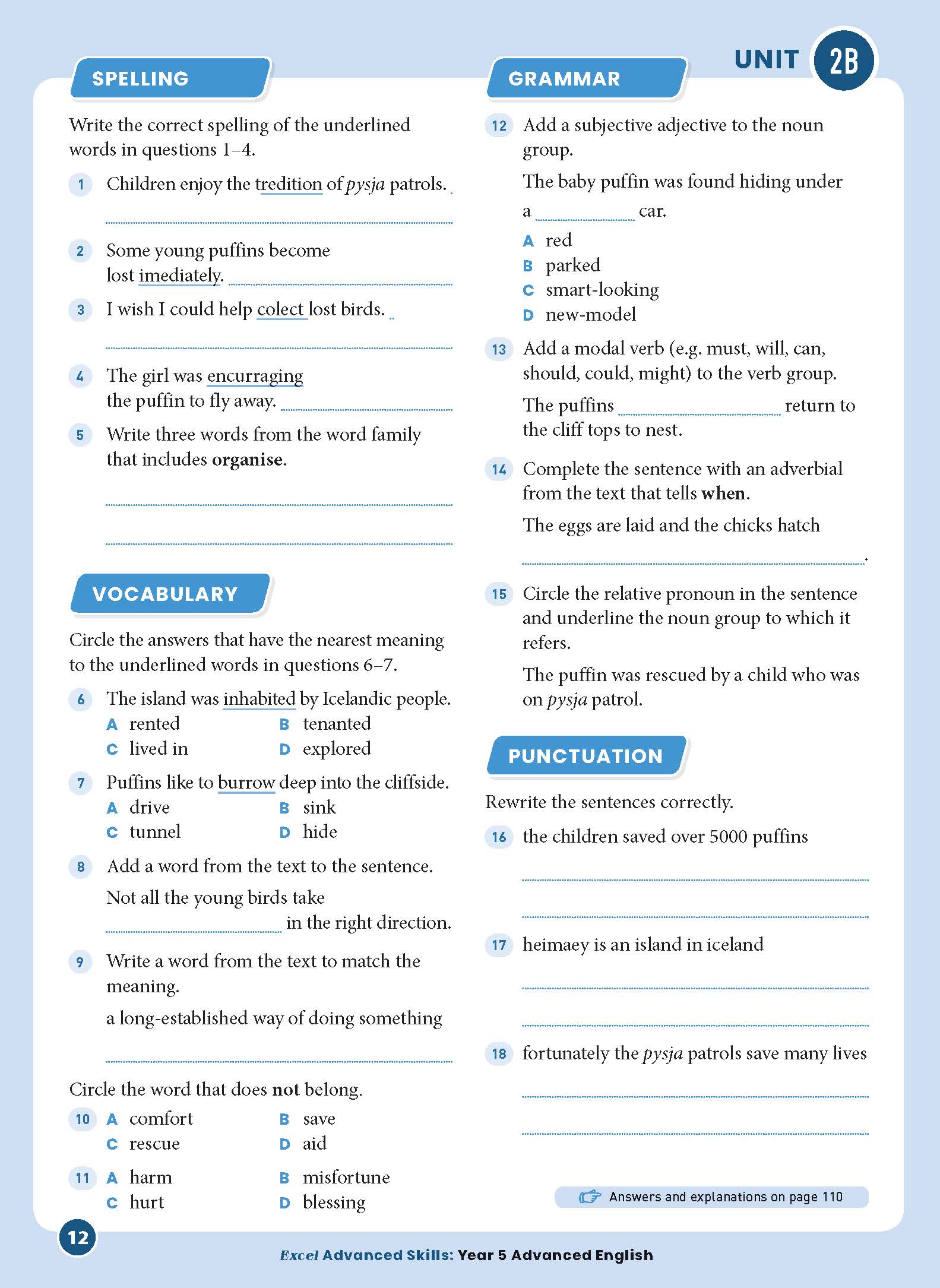• Spelling and vocabulary questions with a focus on advanced work covering topics such as misspelt words, word families, synonyms, definitions and antonyms