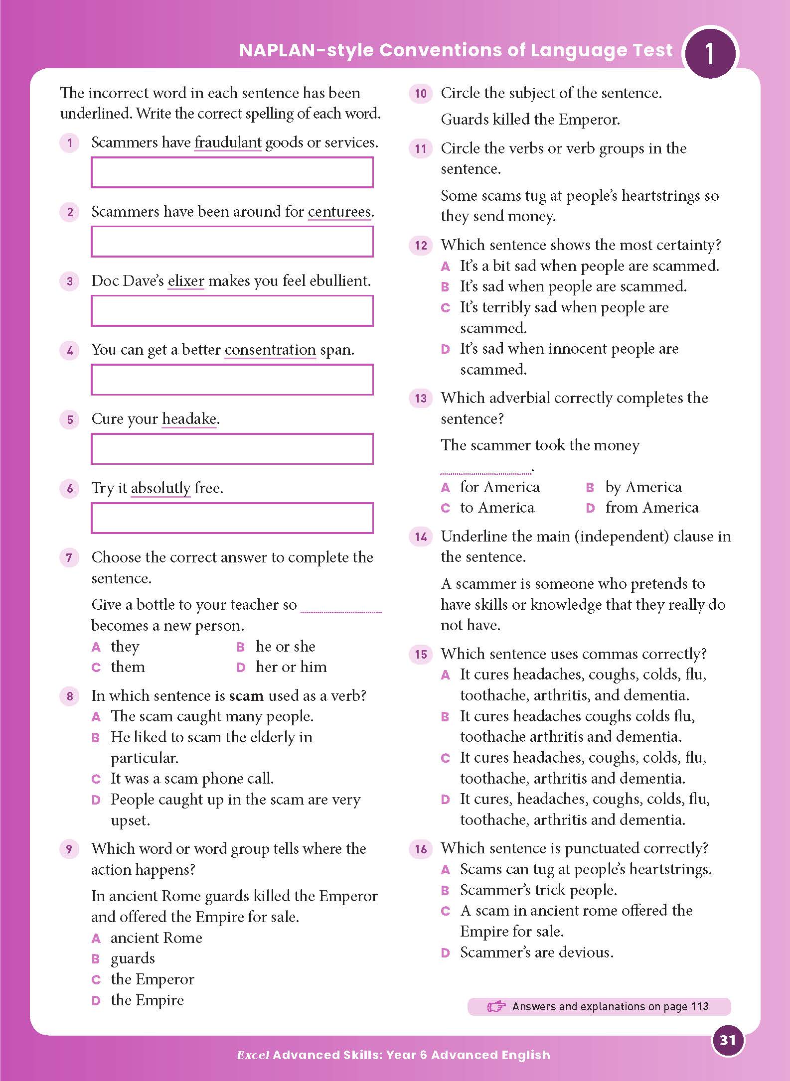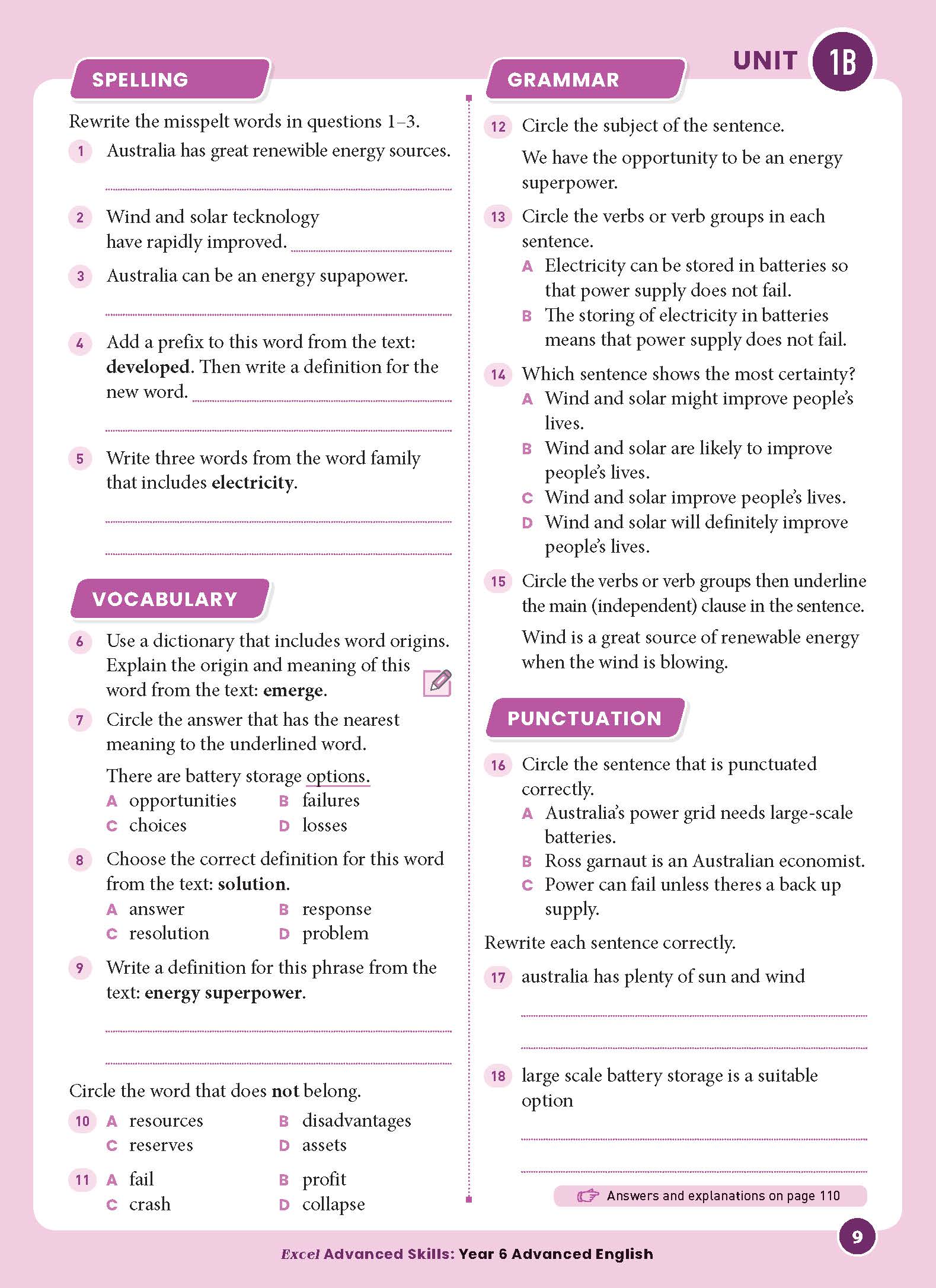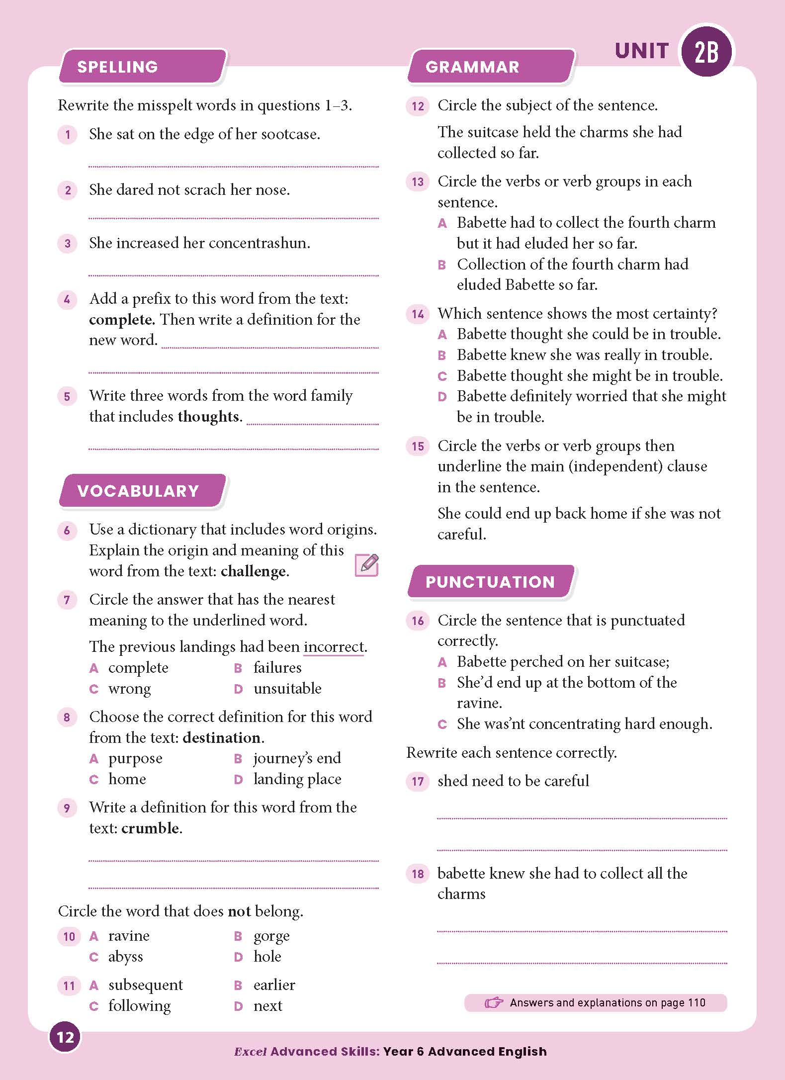 • Spelling and vocabulary questions with a focus on advanced work covering topics such as misspelt words, word families, synonyms, definitions and antonyms