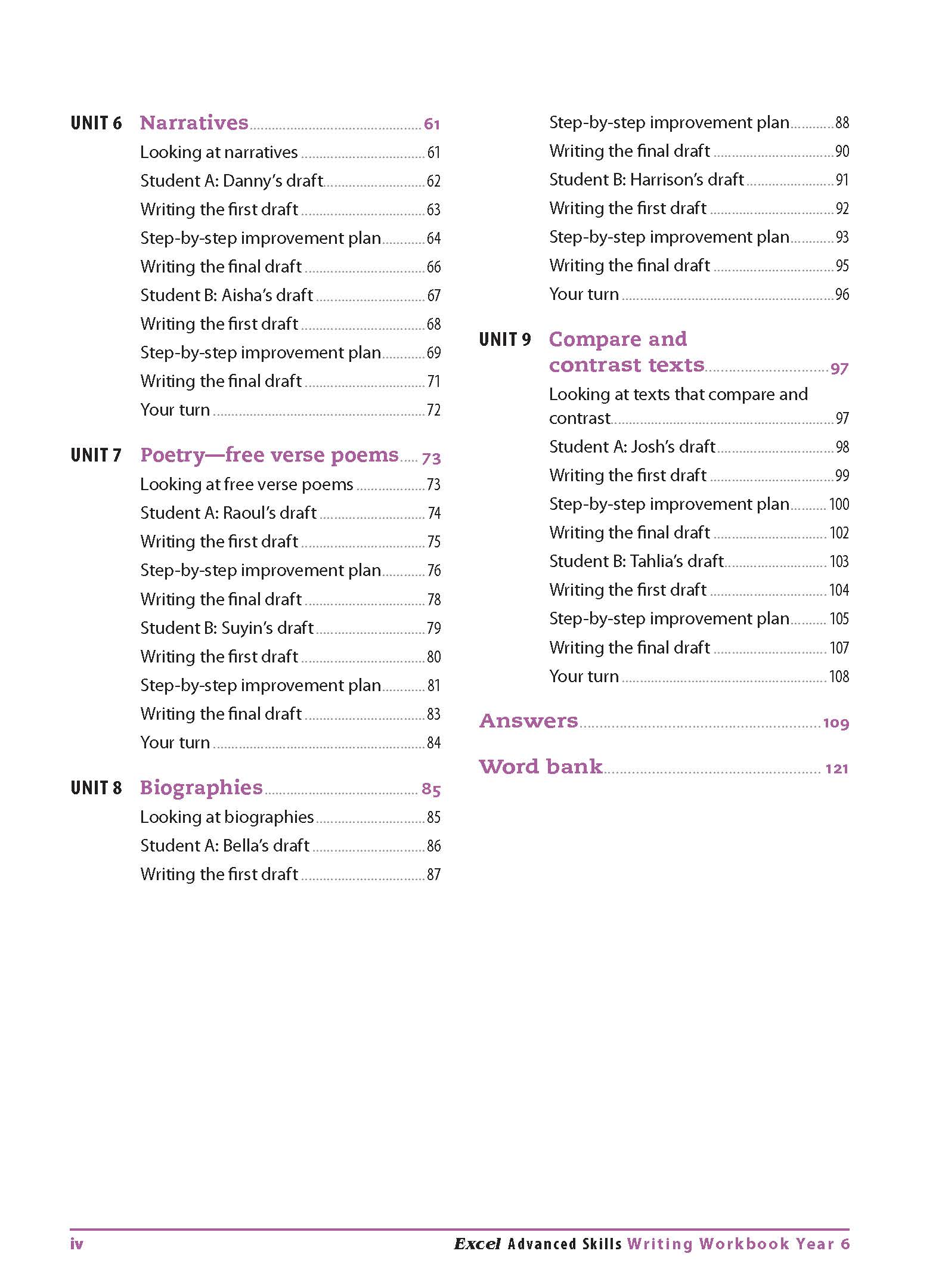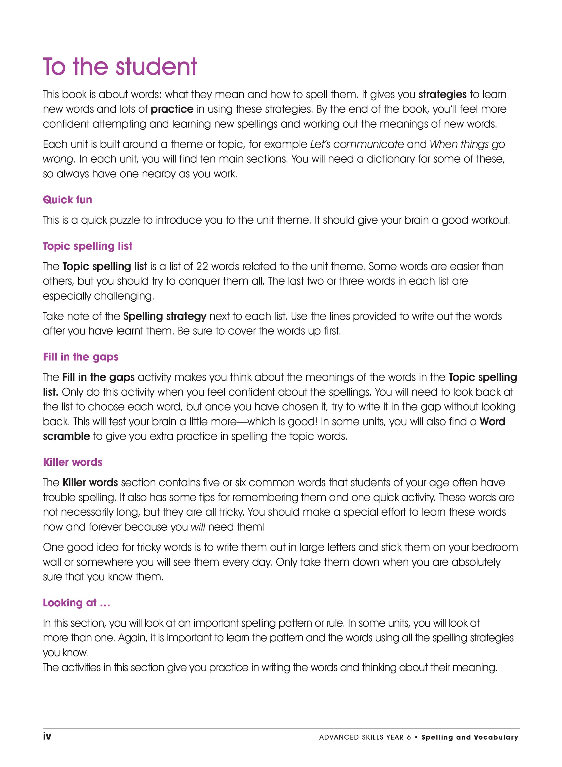 The Excel series of Spelling and Vocabulary Workbooks for Years 1–6 will help primary school students improve their spelling and vocabulary in English and in other subjects. There are 15 self-contained units of work, each with a different theme. Each unit has a different theme and focuses on a set of work dealing with words: what they mean and how to spell them. All activities are designed to encourage students to think about and enjoy language, and to give them meaningful practice in using it.