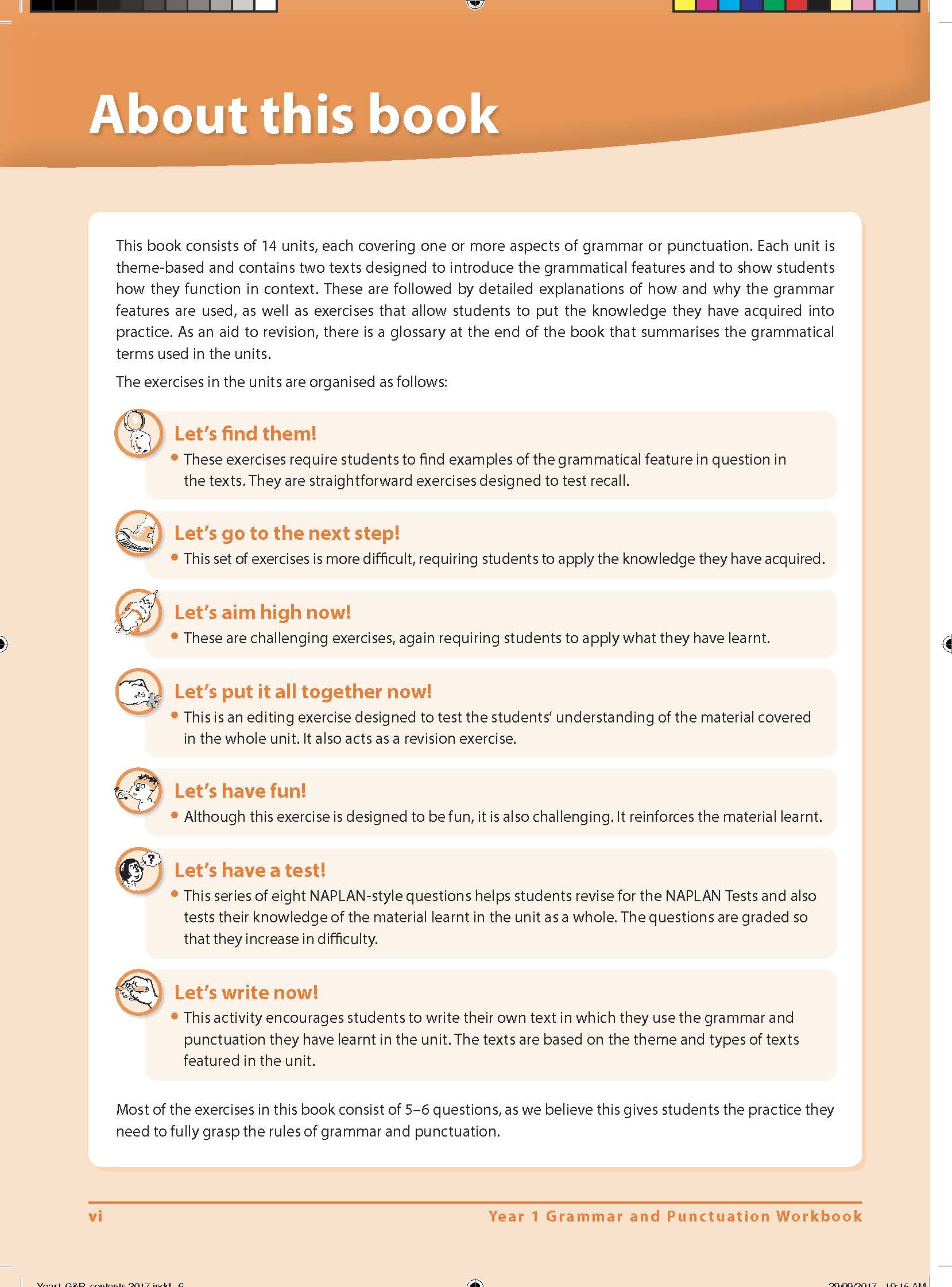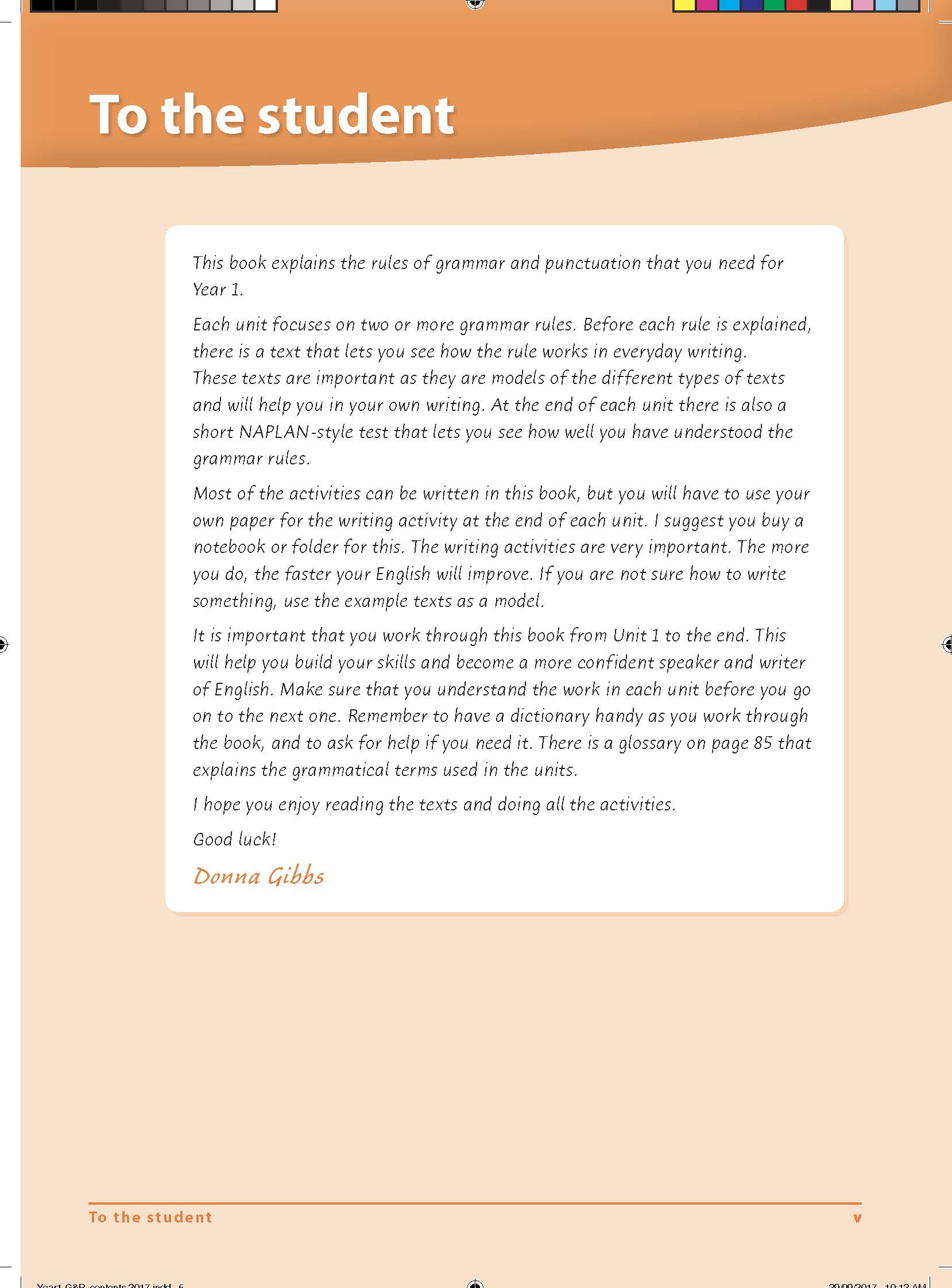 This workbook explains the rules of grammar and punctuation needed to excel in Year 1 English, and other subjects. Each unit has a different theme and focuses on a set of work dealing with two or more grammar or punctuation rules and how they work in everyday writing. Activities are designed to encourage Year 1 students to think about and enjoy language.