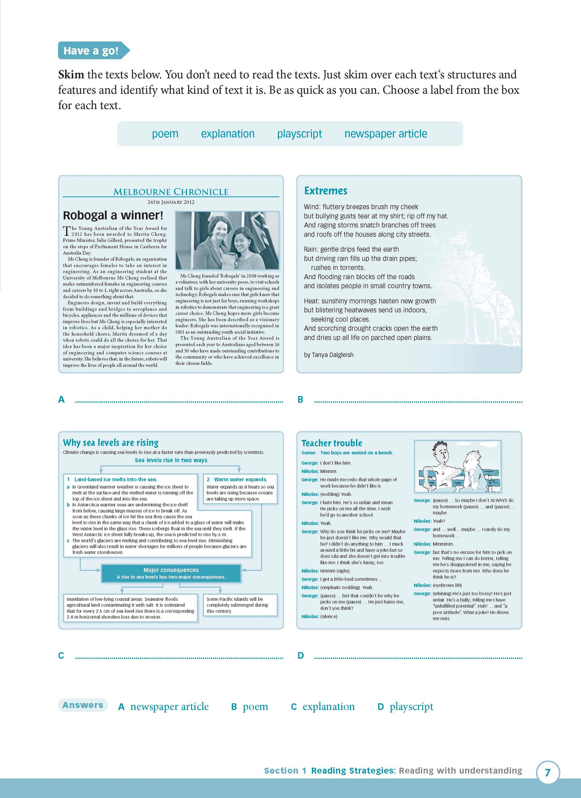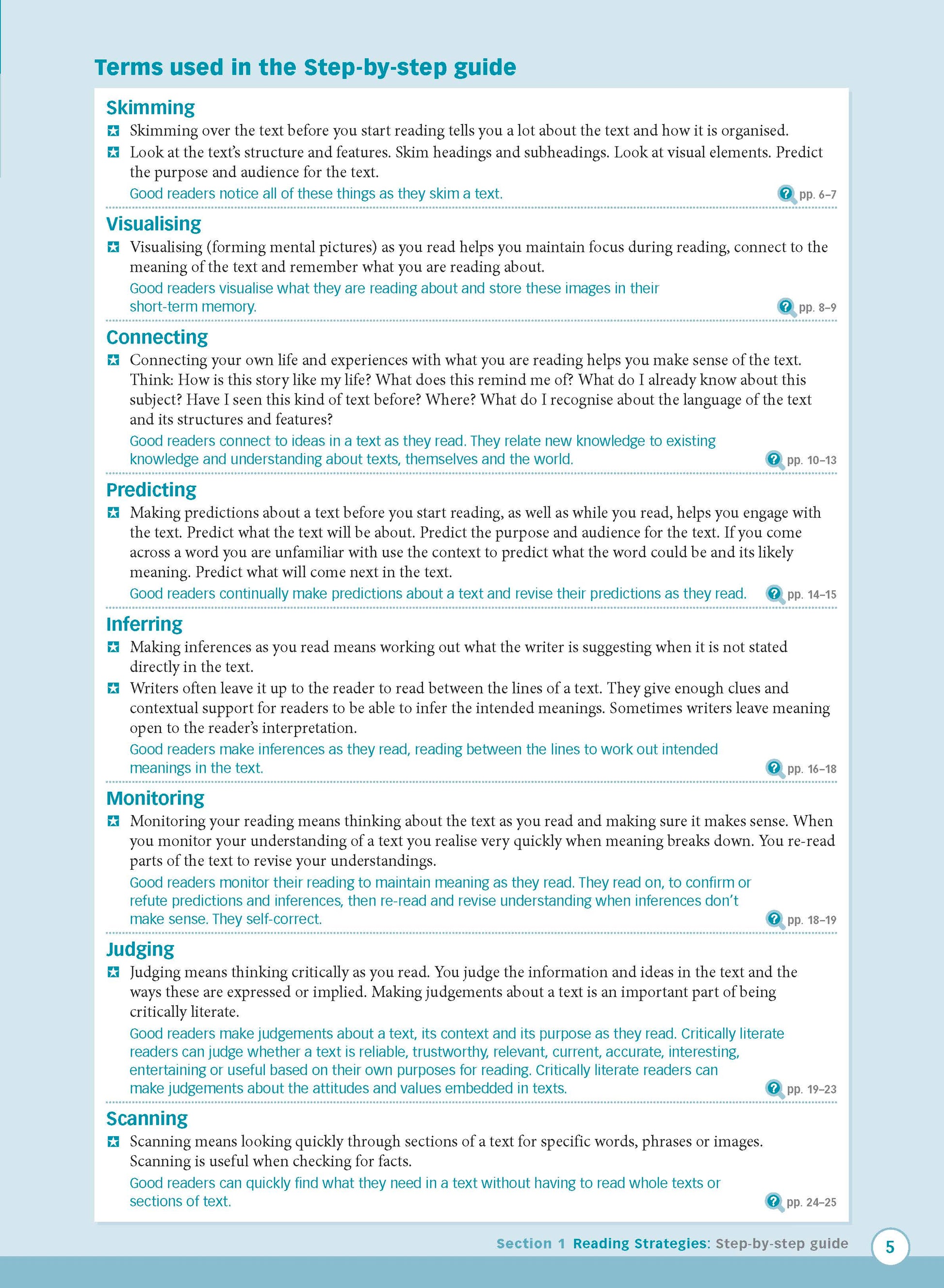 The first part of the book focuses on reading strategies such as skimming, scanning, visualising, connecting, predicting, inferring, monitoring and judging (reading reflectively and critically).