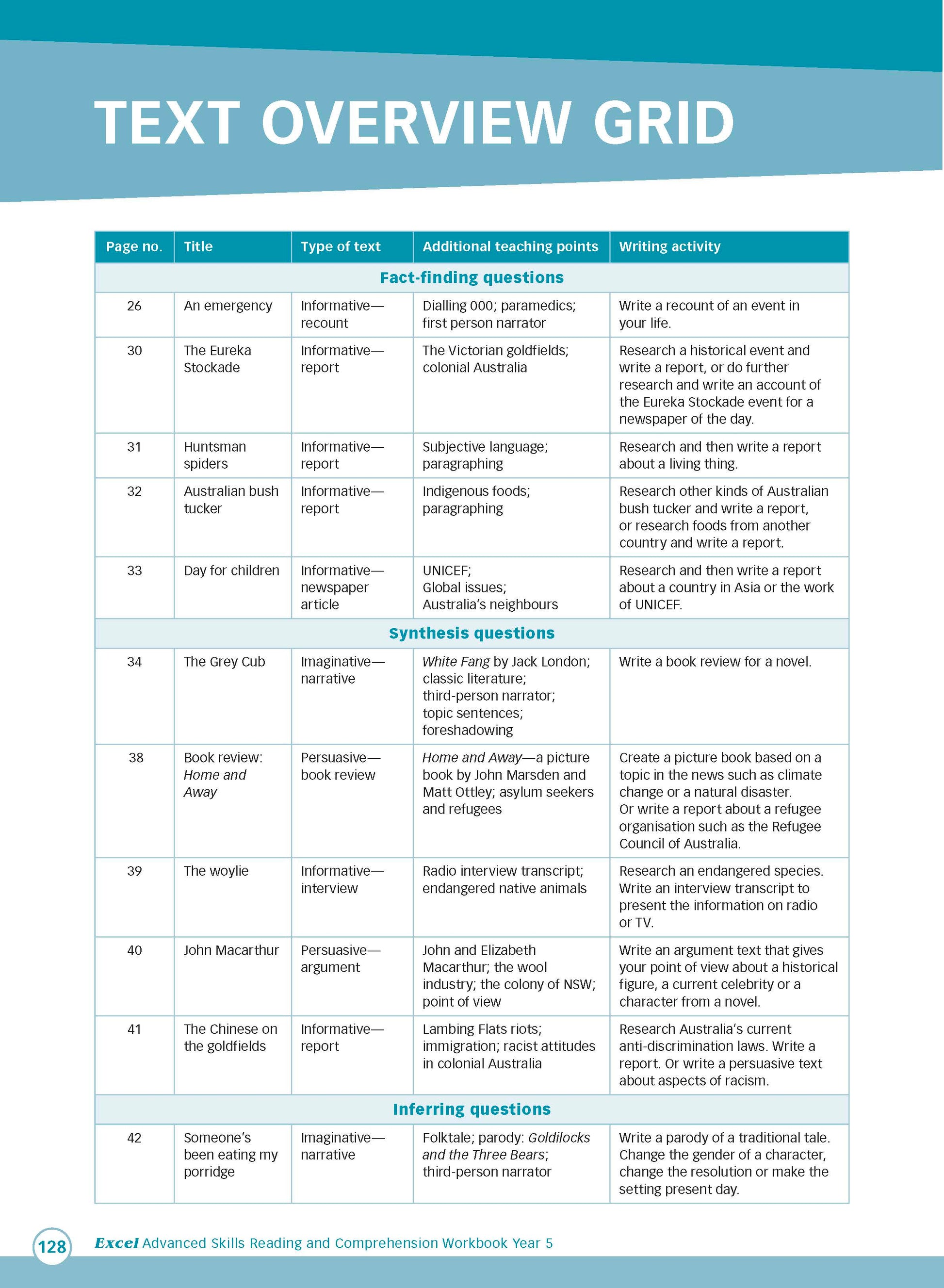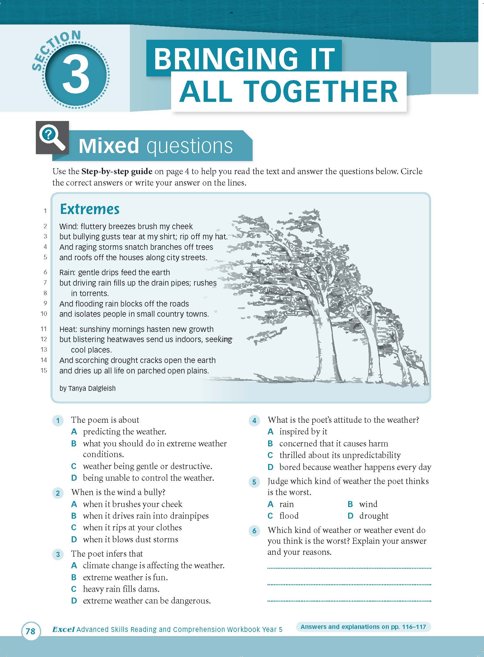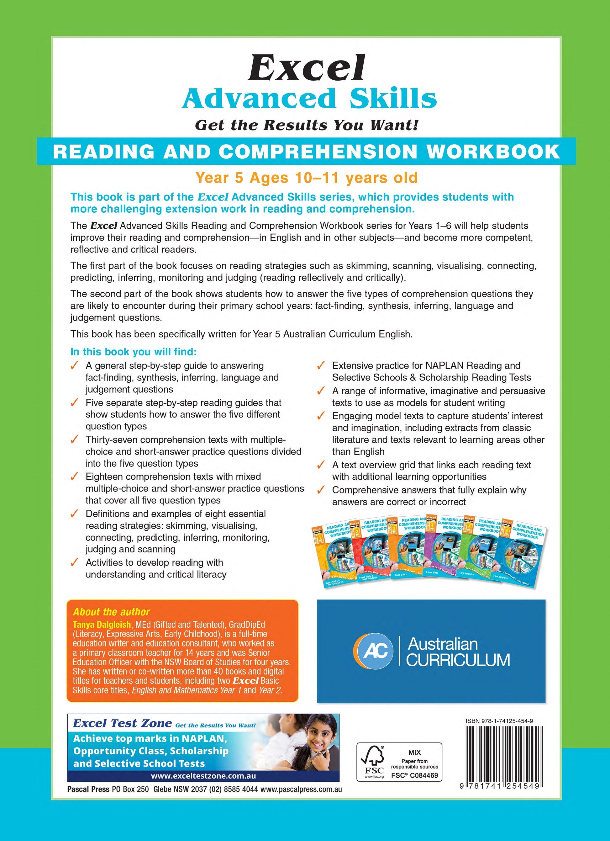 The Excel Advanced Skills Reading and Comprehension Workbook Year 5 will help students improve their reading and comprehension—in English and in other subjects—and become more competent, reflective and critical readers.
