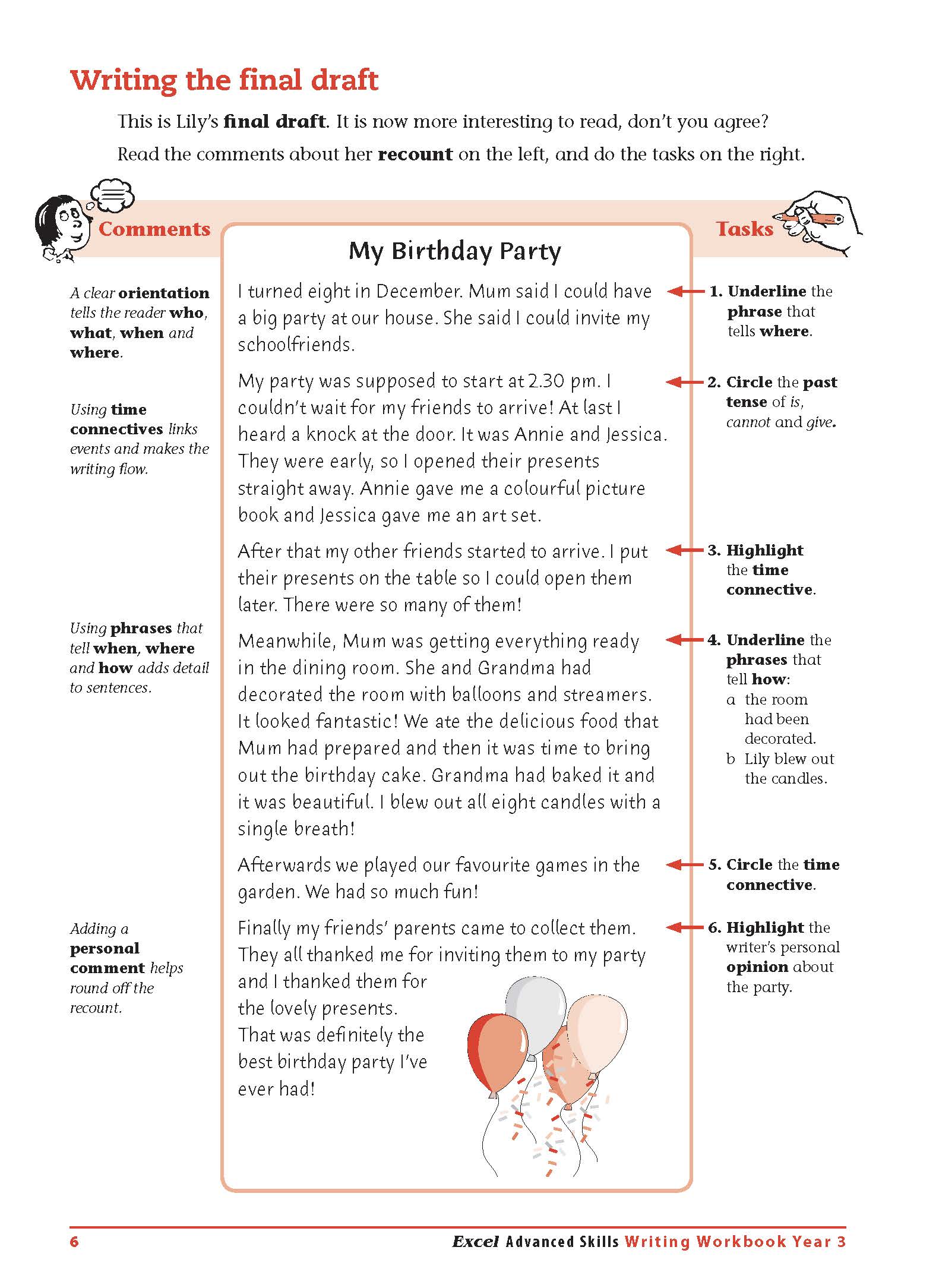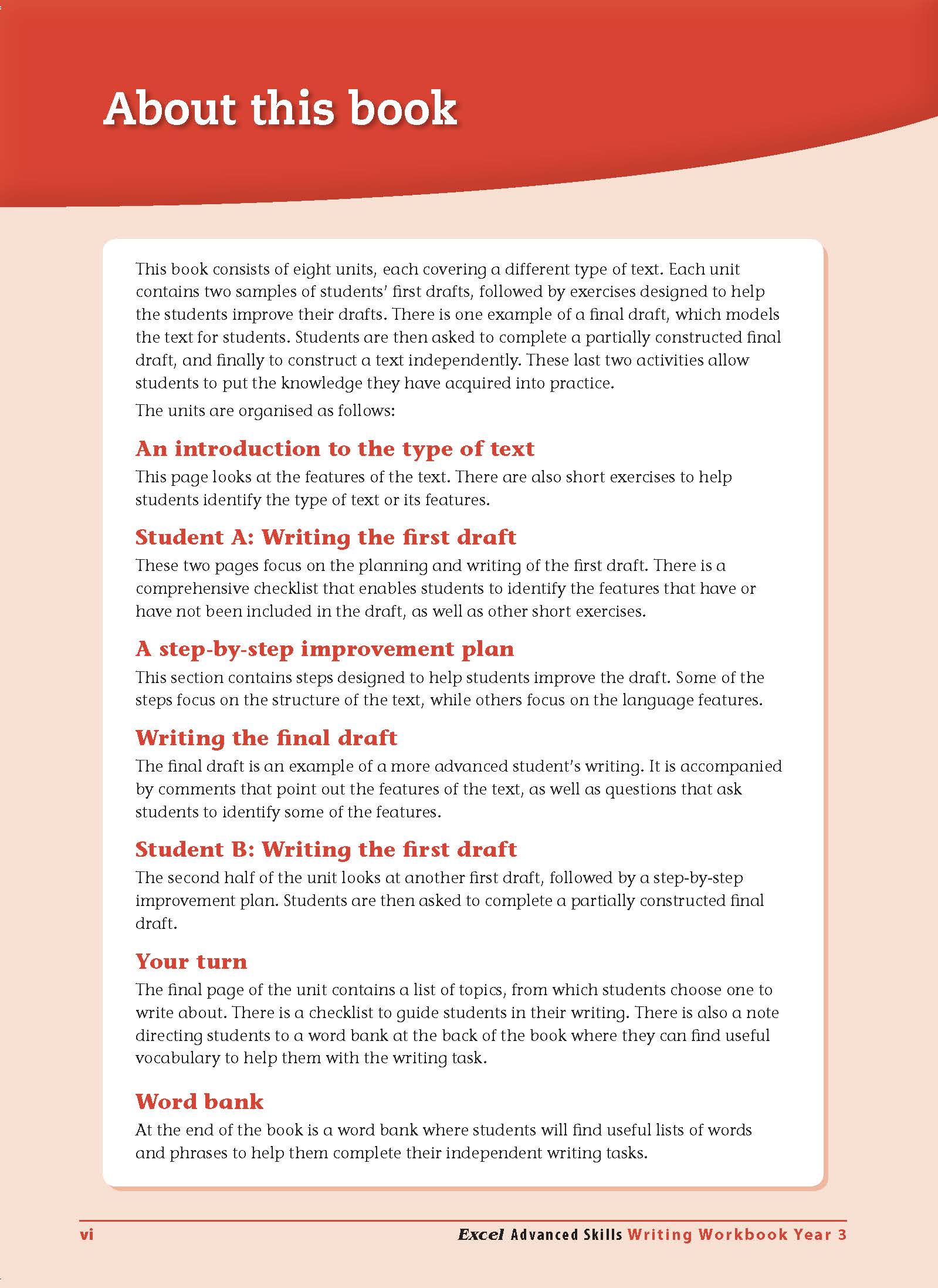 The Excel series of Writing Workbooks for Years 1–6 will help primary school students improve their writing in English and other subjects. Each unit focuses on a different type of text by looking at its particular features and how to apply them. All activities are designed to encourage students to think about and enjoy writing, and to give them meaningful practice in improving their own writing.