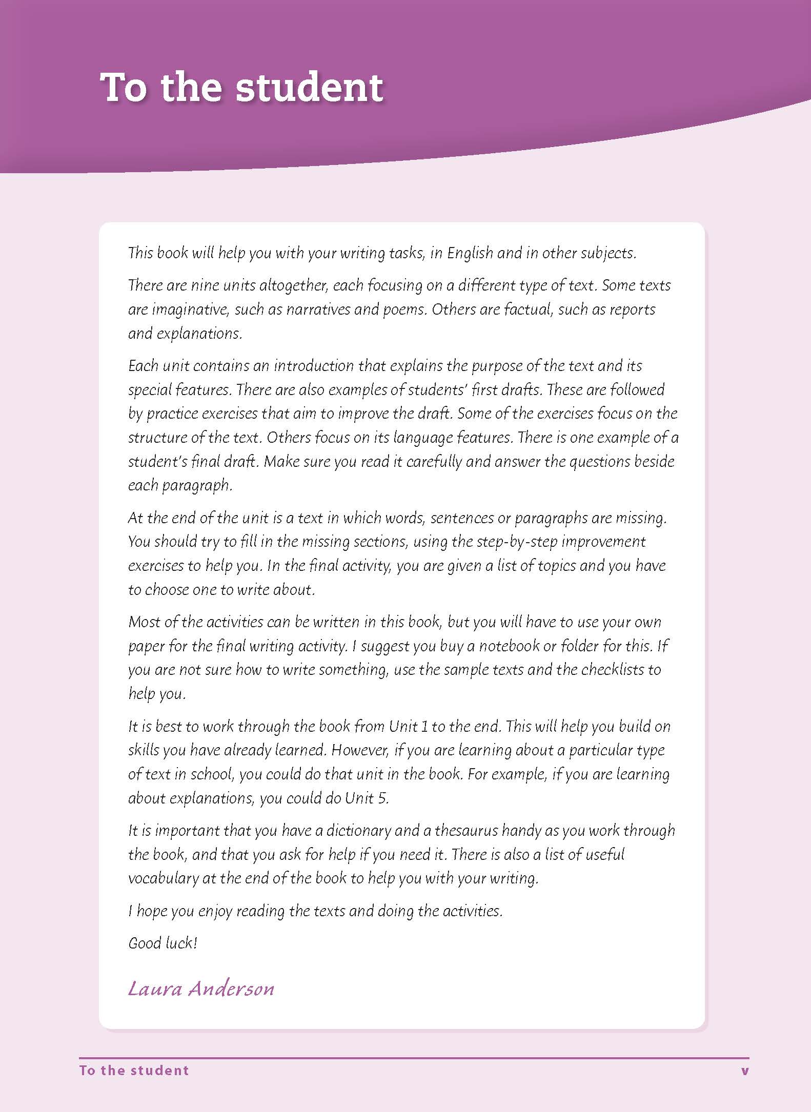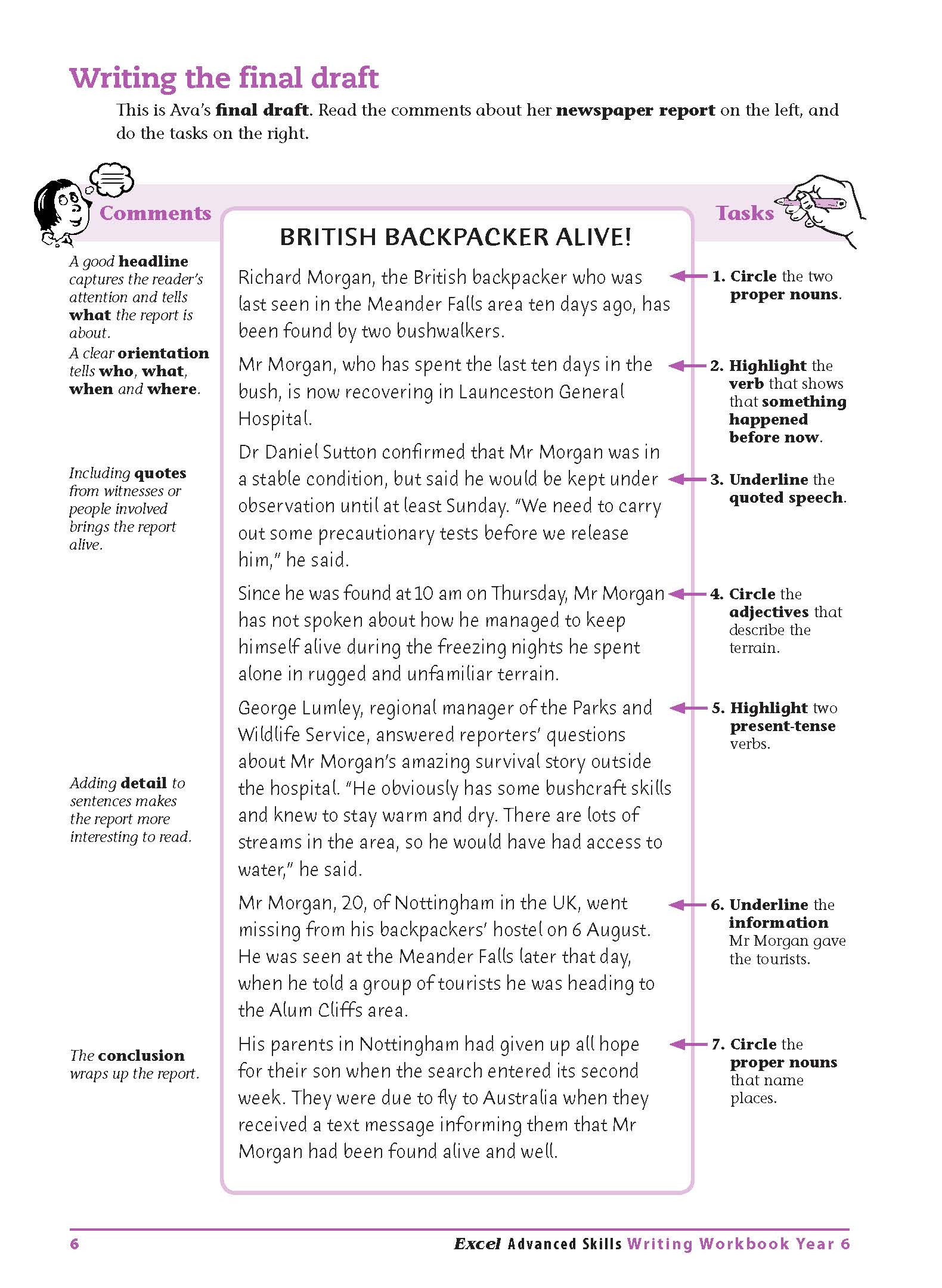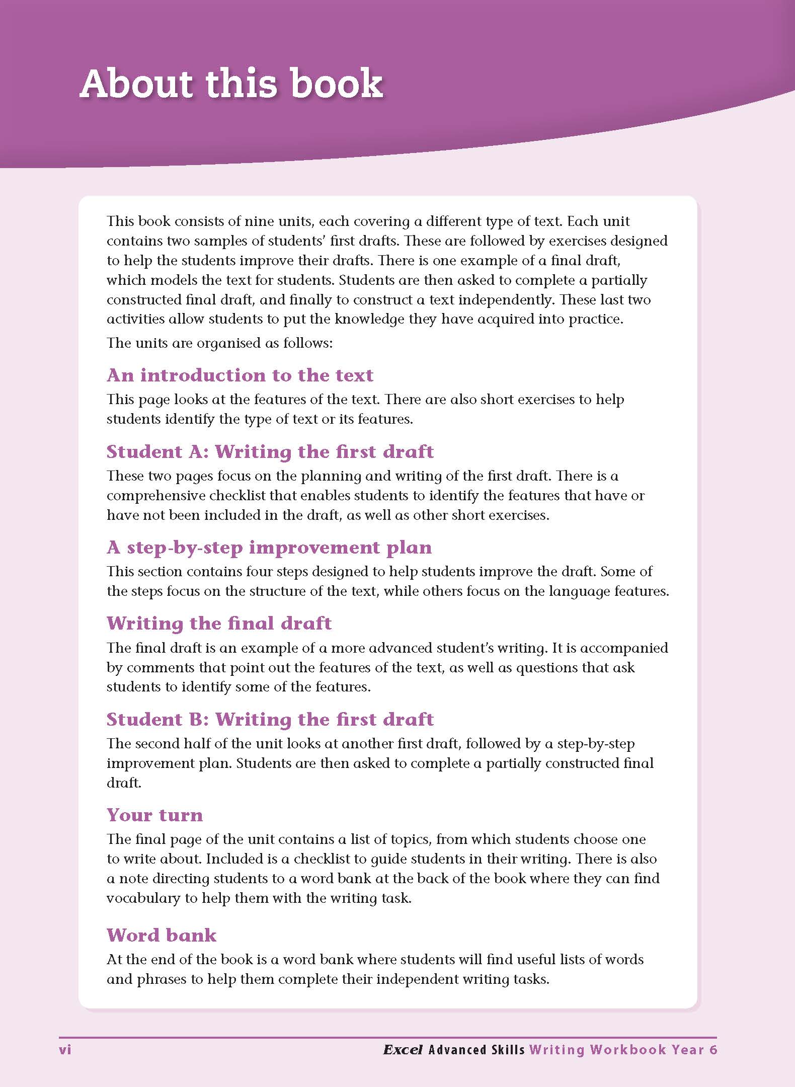 The Excel Advanced Skills Writing Workbook series for Years 1-6 will help primary school students improve their writing in English. Each unit focuses on a different type of text by looking at its particular features and how to apply them. All activities are designed to encourage students to think about and enjoy writing, and to give them meaningful practice in improving their own writing.