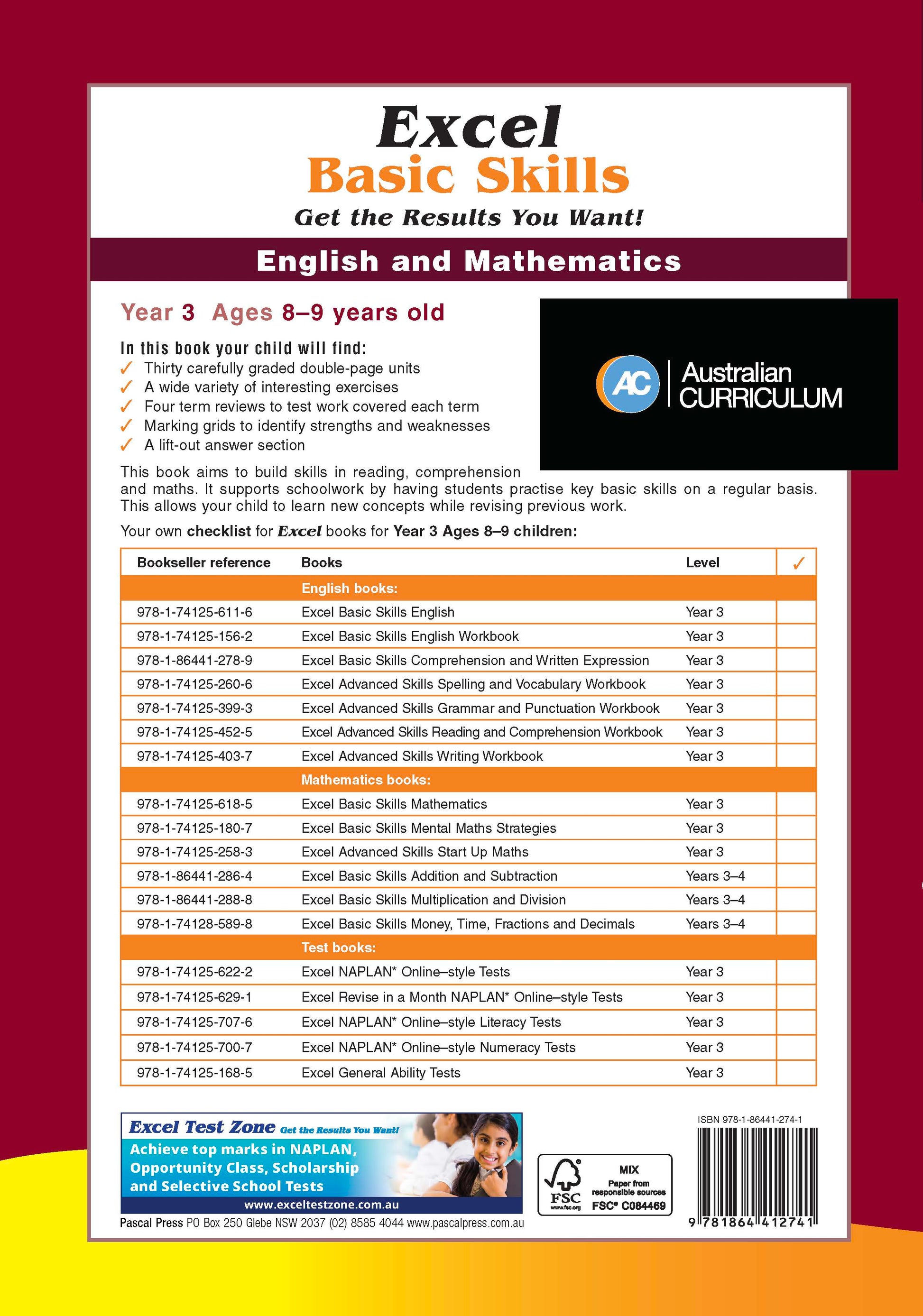 Excel Basic Skills English and Mathematics Year 3 aims to build basic skills in reading, comprehension and maths for Year 3 students, in line with Australian Curriculum outcomes. It supports schoolwork by having students practise key basic skills on a regular basis, allowing them to learn new concepts while revising program work.