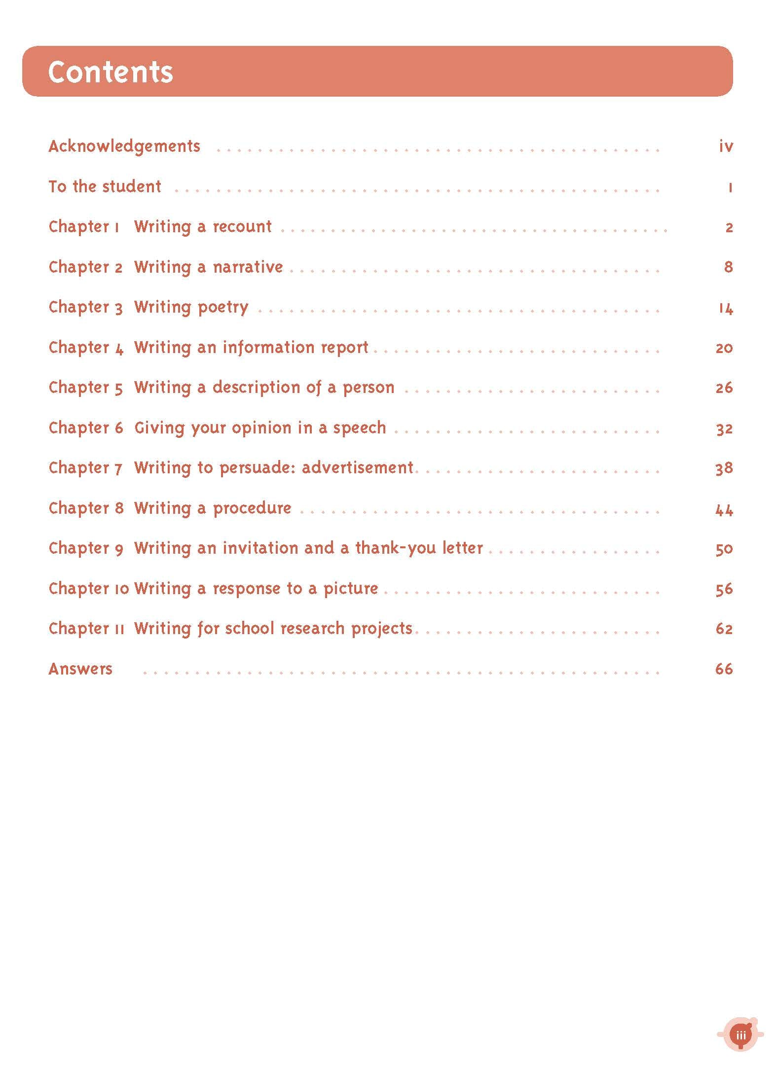 • eleven chapters, each set out as a unit of work covering a particular text type (such as narratives, letters, speeches and information reports), including a chapter on writing for school projects