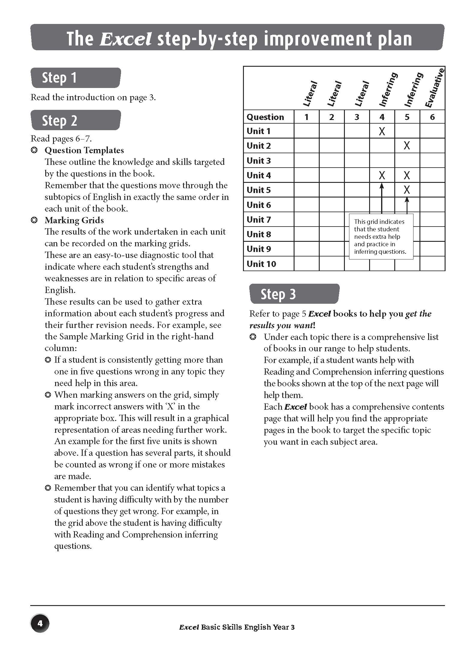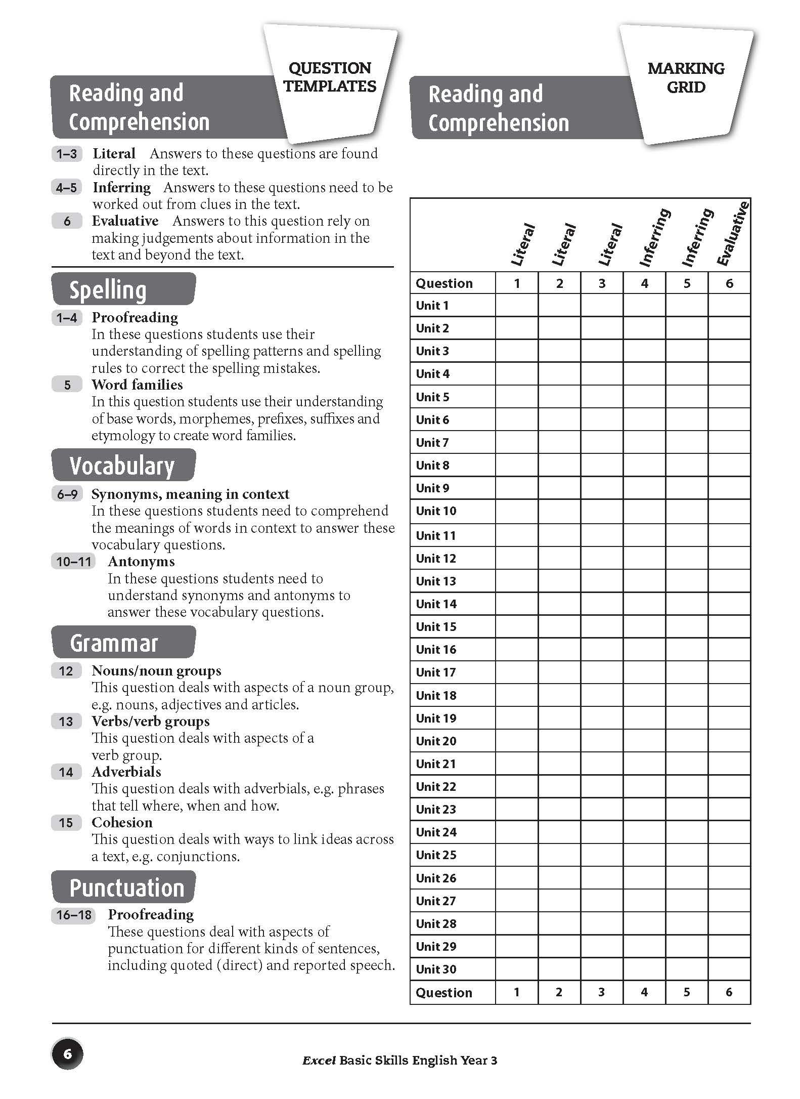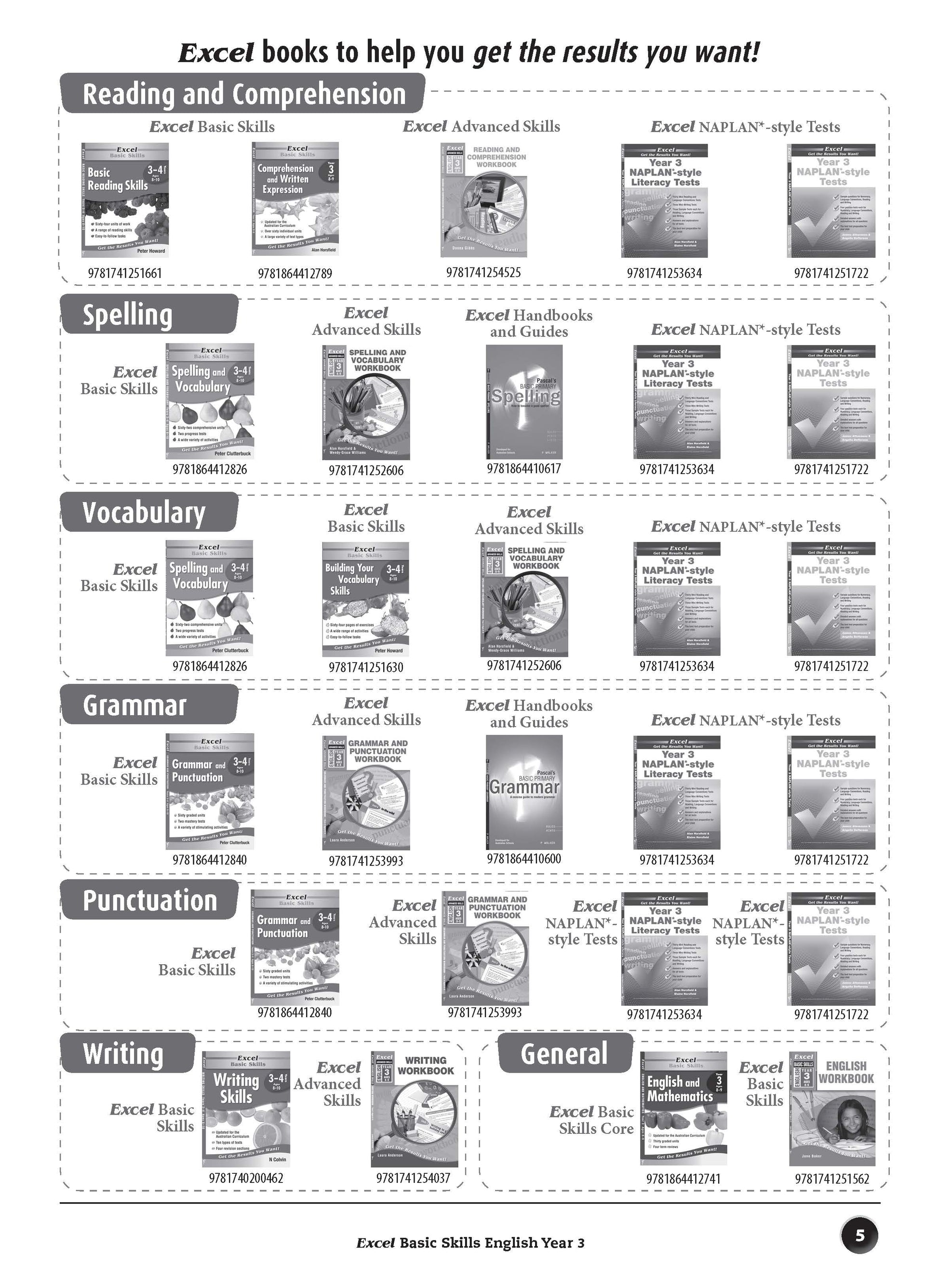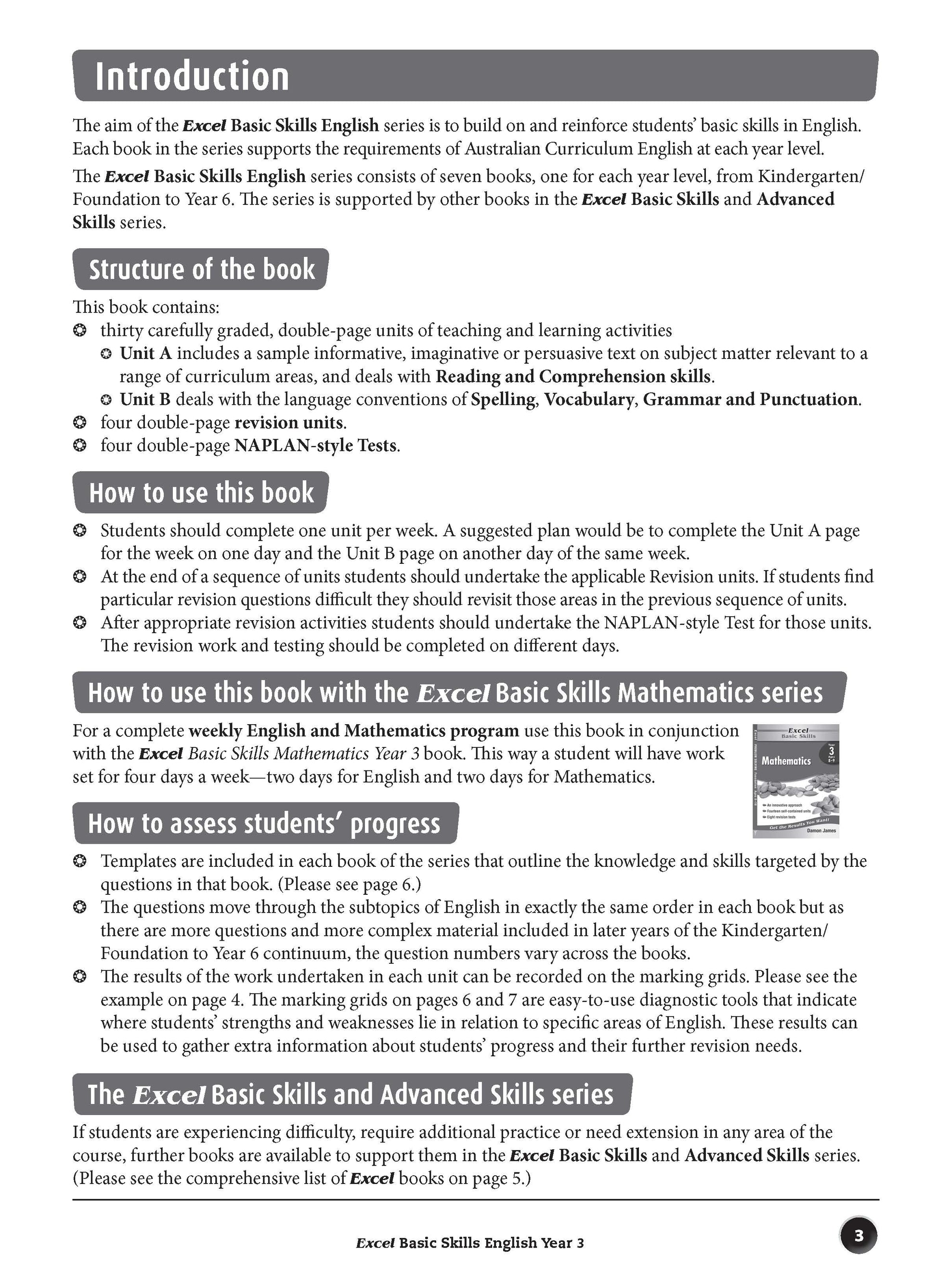 The aim of this book is to build basic skills in reading, comprehension, spelling, vocabulary, grammar and punctuation. The format of each unit is the same so that students become familiar with the requirements of each question, which become progressively more difficult as students work through the book. The sequence of units allows for regular practice that will reinforce the basic English skills taught in schools.