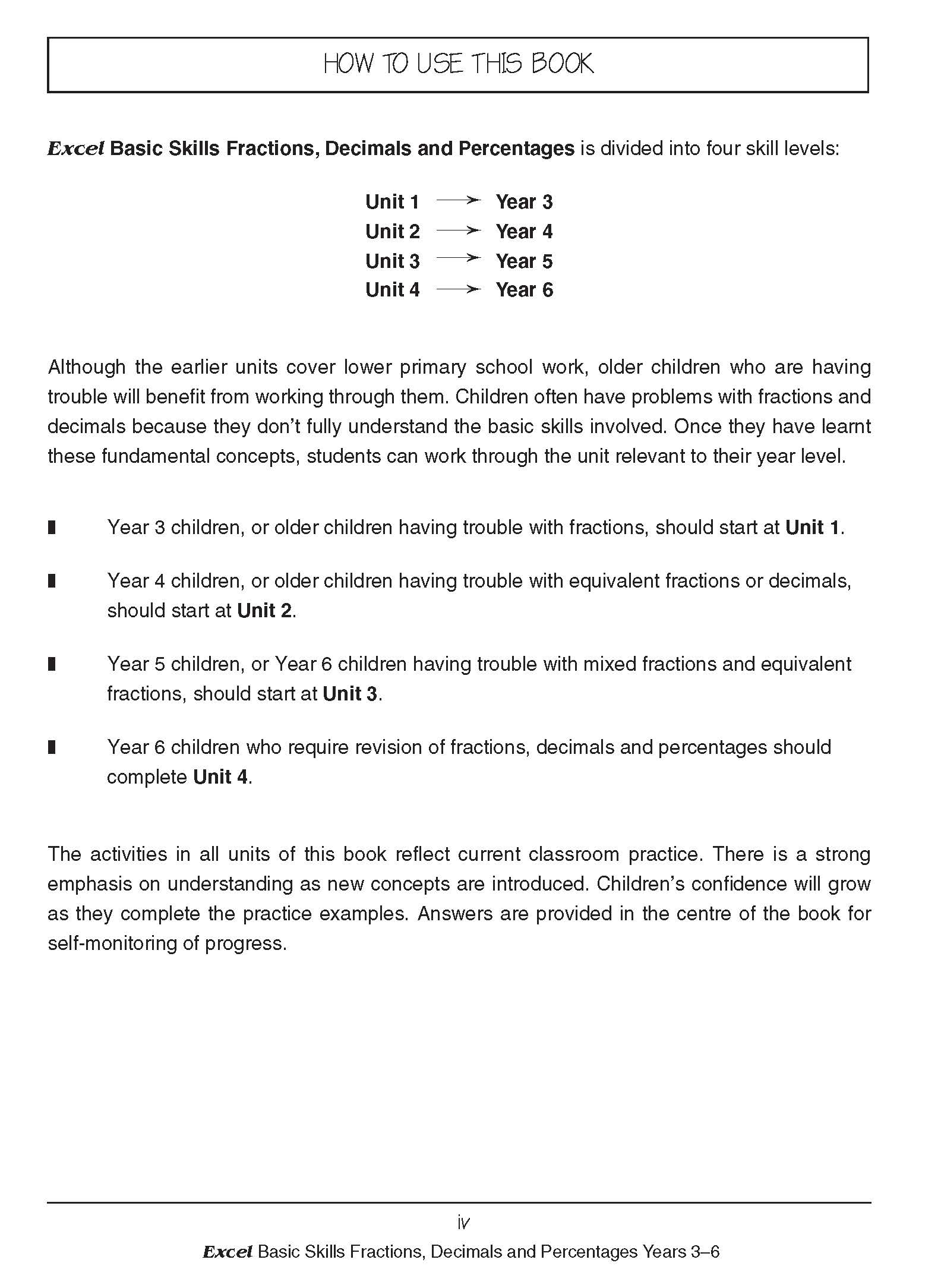 Excel Maths: Fractions, Decimals and Percentages is divided into four skill levels. Although the earlier units cover lower primary school work, older children who are having trouble will benefit from working through them. Children often have problems with fractions and decimals because they don't fully understand the basic skills involved. Once they have learnt these fundamental concepts, the student can work through the unity relevant to their Year level.