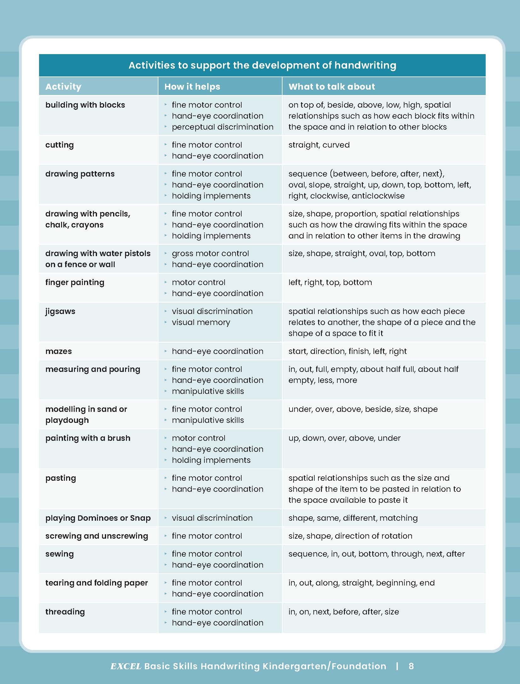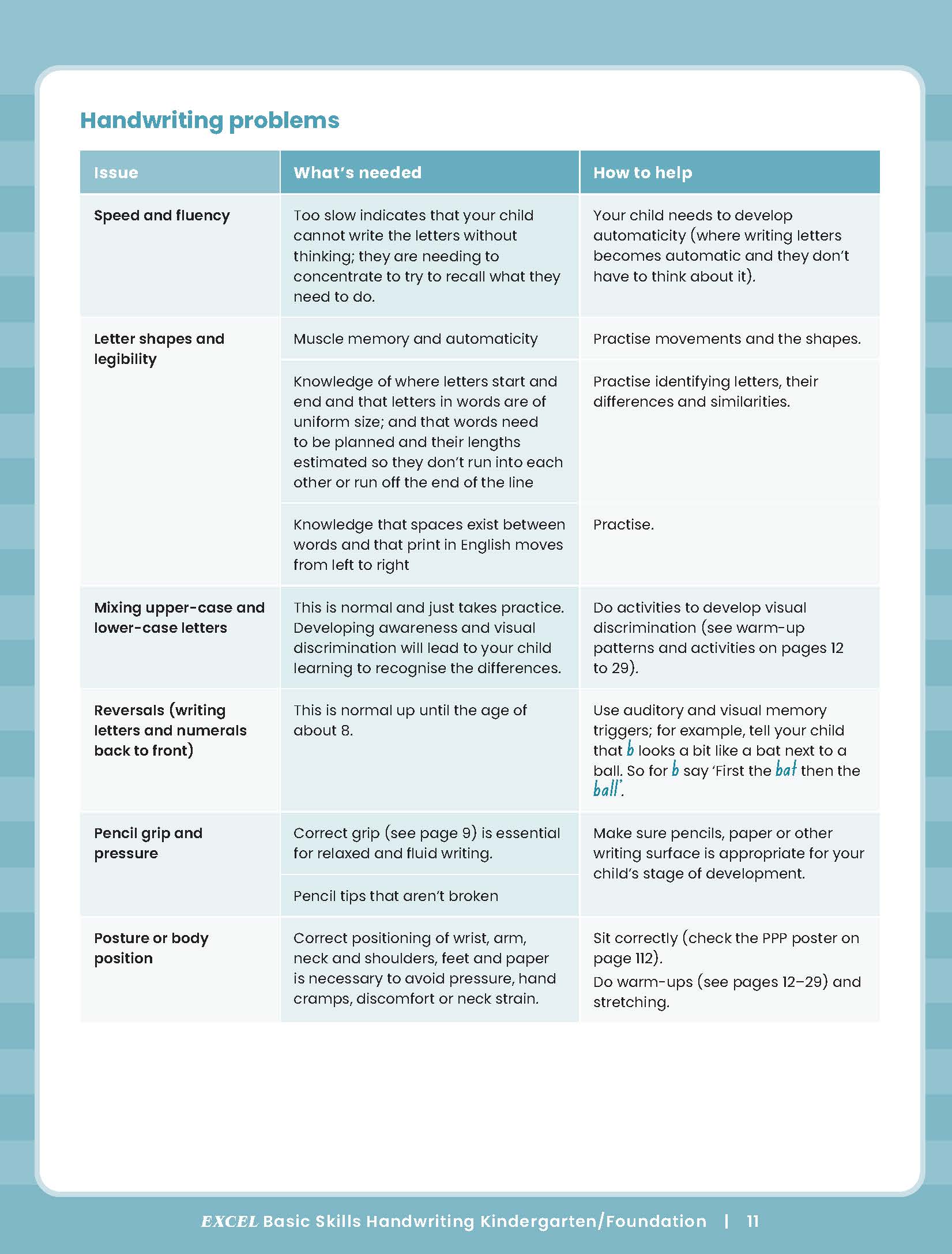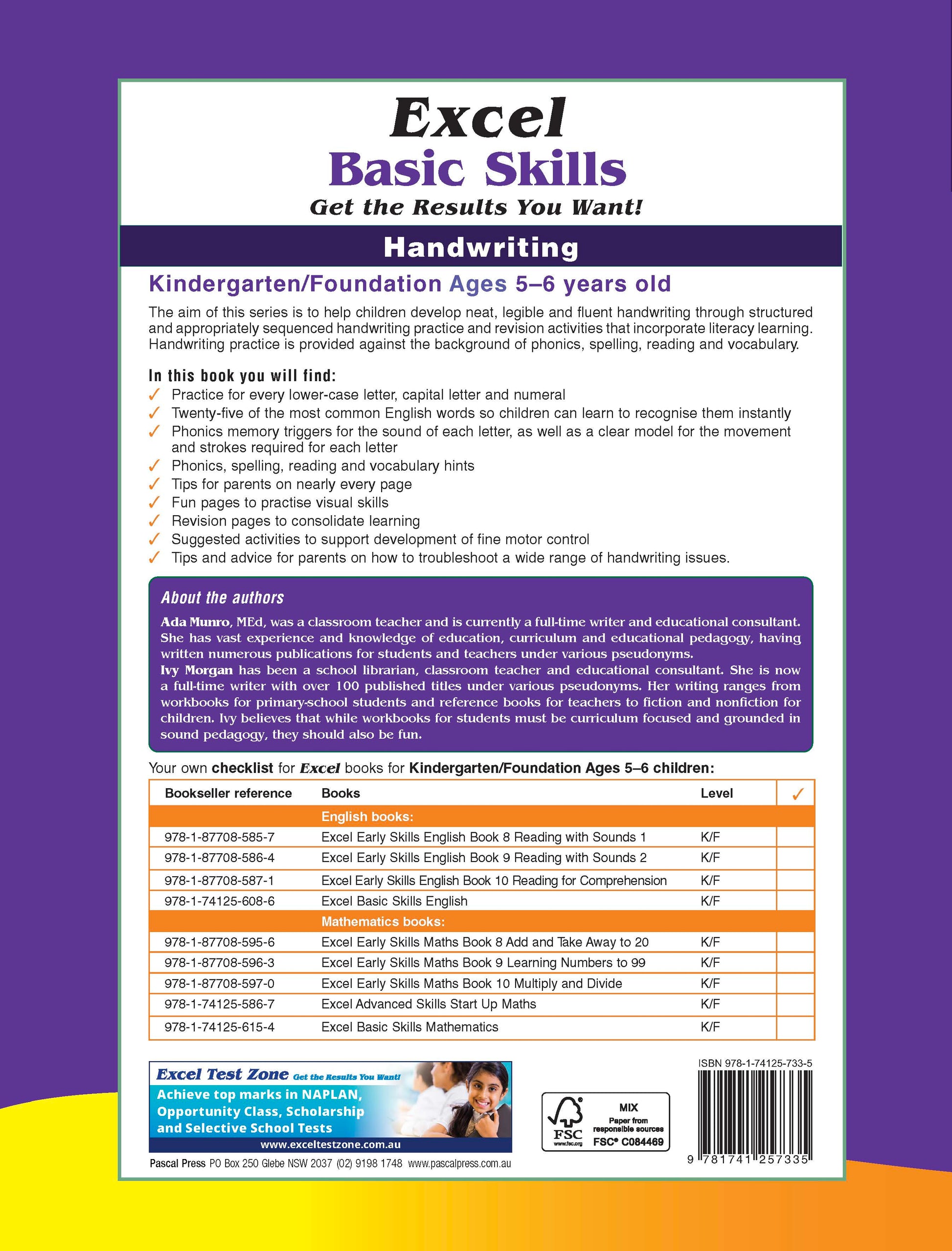The Excel Basic Handwriting Skills series aims to help primary-aged children develop neat, legible and fluent handwriting through structured and appropriately sequenced handwriting practice and revision activities that incorporate literacy learning. Handwriting practice is provided against the background of phonics, spelling, reading and vocabulary.