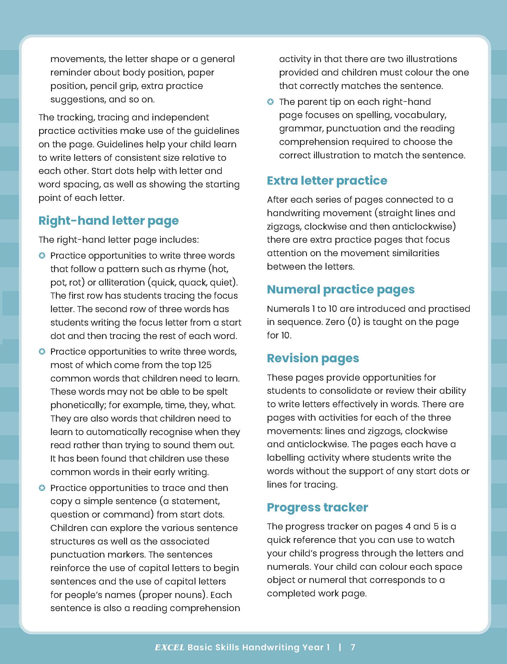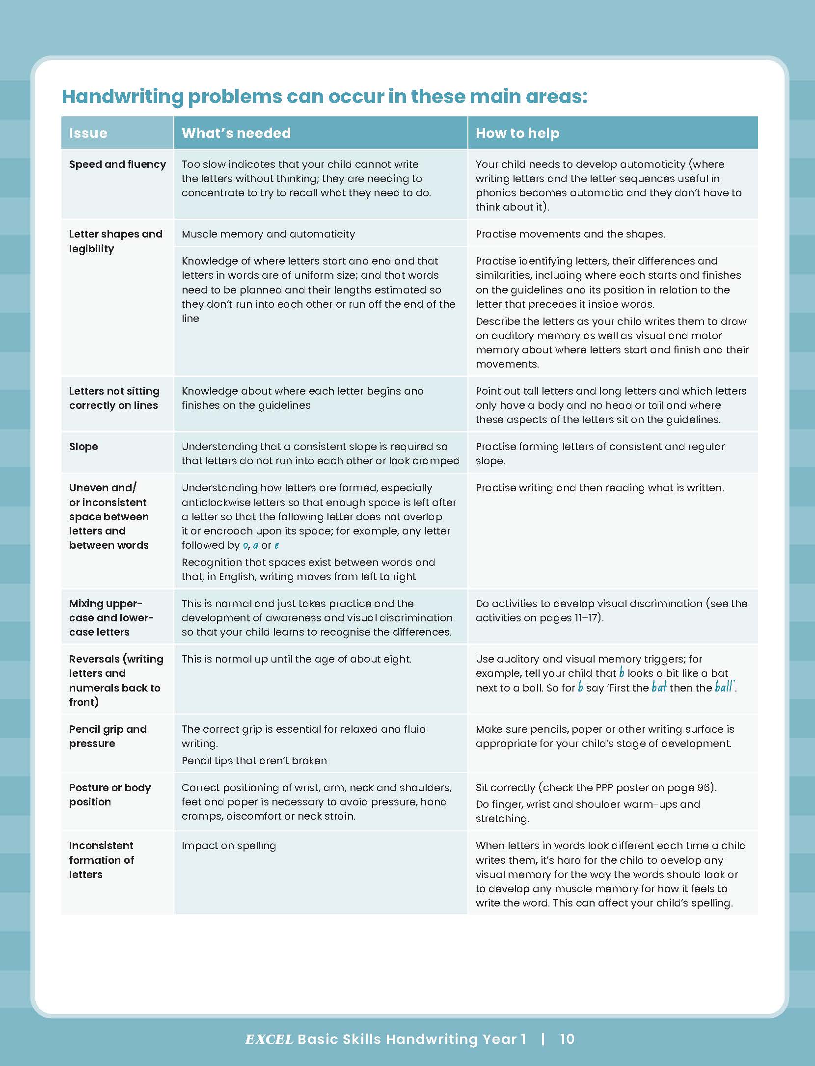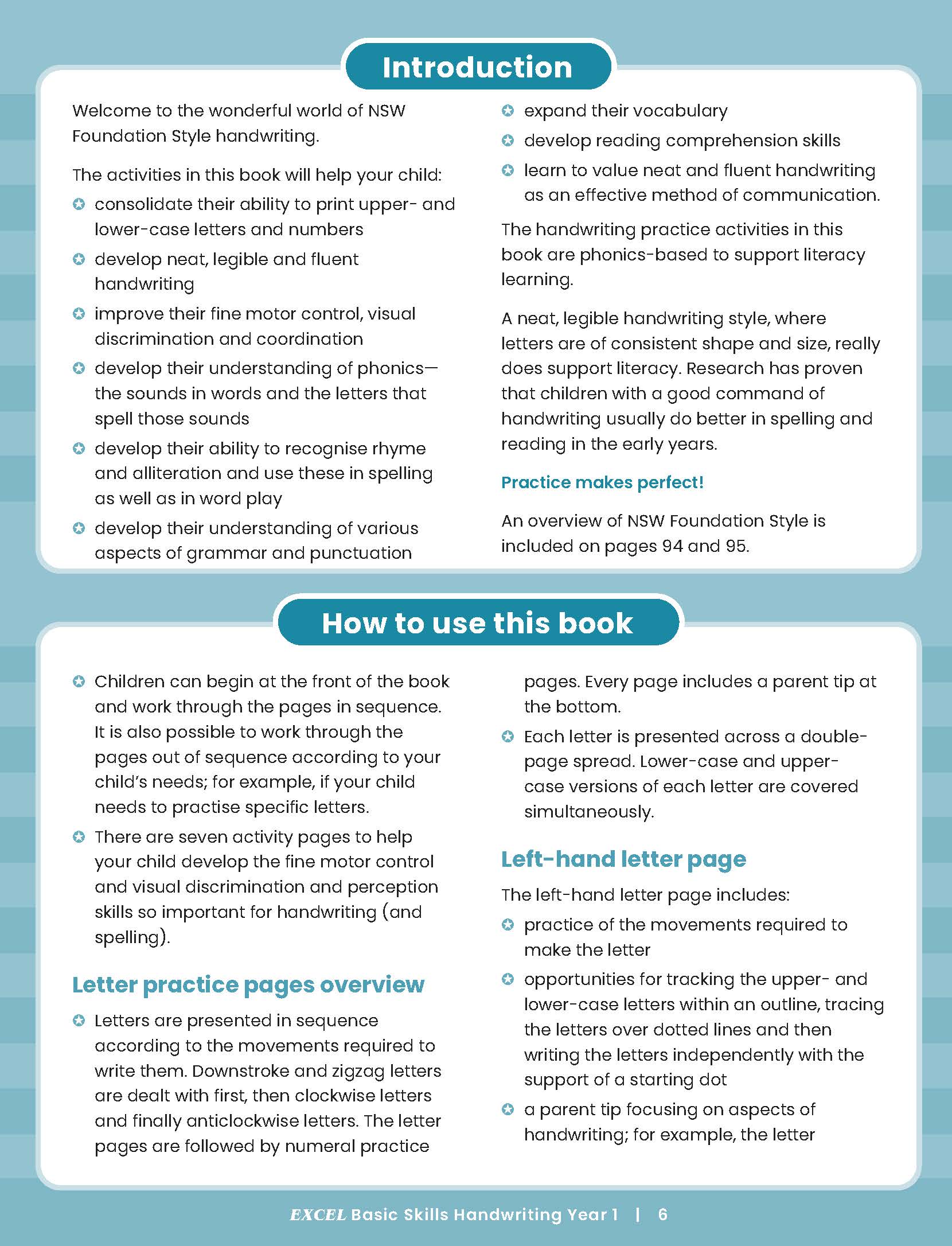 The Excel Basic Handwriting Skills series aims to help primary-aged children develop neat, legible and fluent handwriting through structured and appropriately sequenced handwriting practice and revision activities that incorporate literacy learning. Handwriting practice is provided against the background of phonics, spelling, reading and vocabulary.