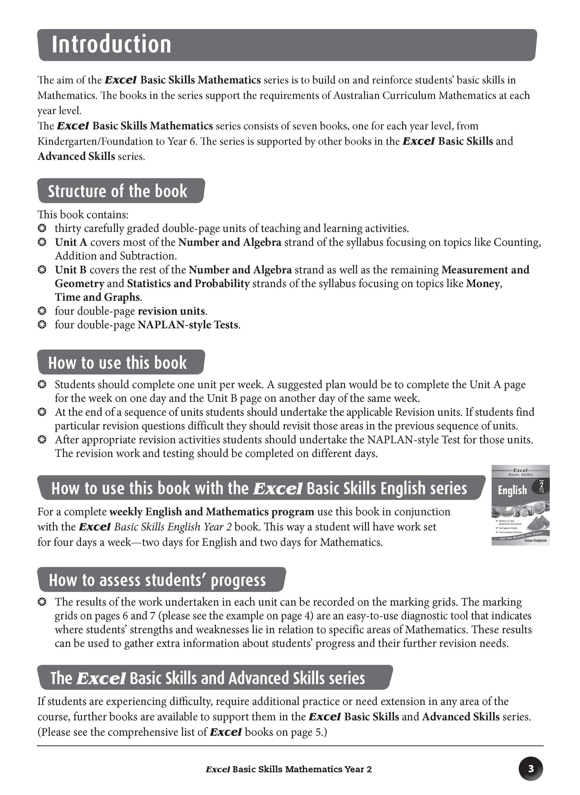 The aim of this book is to build basic skills in Mathematics. The format of each unit is exactly the same, so that each question covers the same Australian Curriculum topics throughout the book. The content of the questions becomes progressively more difficult as students work through the book. The sequence of units allows for regular practice that will reinforce the basic Mathematics skills taught in schools.