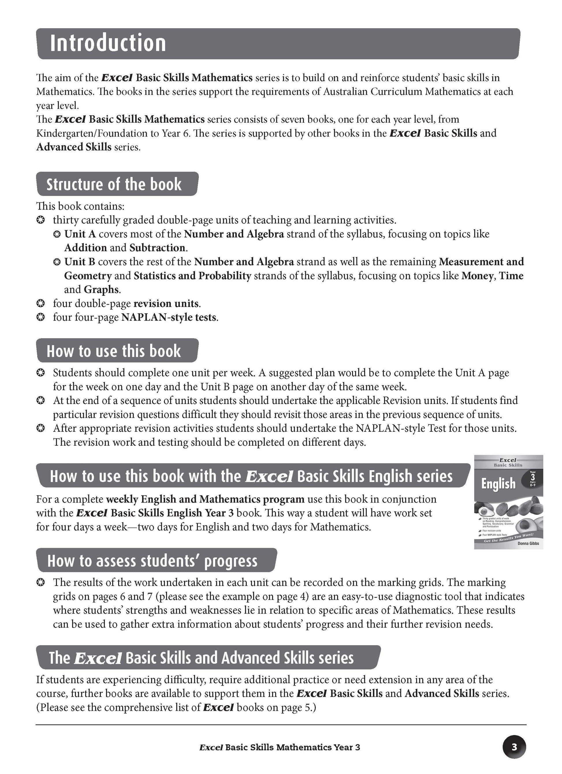 The aim of this book is to build basic skills in Mathematics. The format of each unit is exactly the same, so that each question covers the same Australian Curriculum topics throughout the book. The content of the questions becomes progressively more difficult as students work through the book. The sequence of units allows for regular practice that will reinforce the basic Mathematics skills taught in schools.