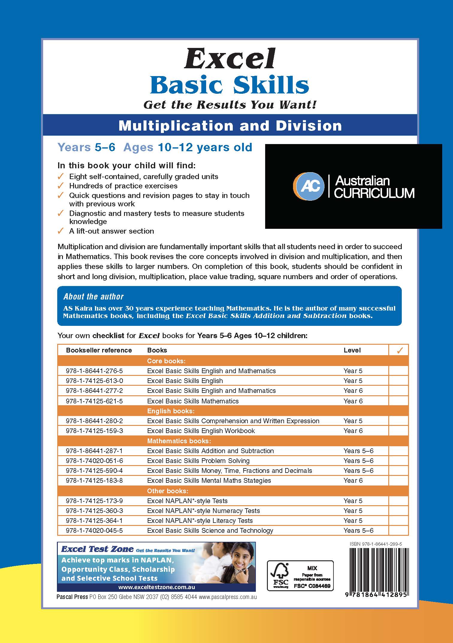 Excel Basic Skills: Multiplication and Division Year 5–6 is designed to make students feel confident in the basic processes of multiplication and division of whole numbers. It will help to satisfy the needs of slow learners, and provide enrichment opportunity for quicker learners.