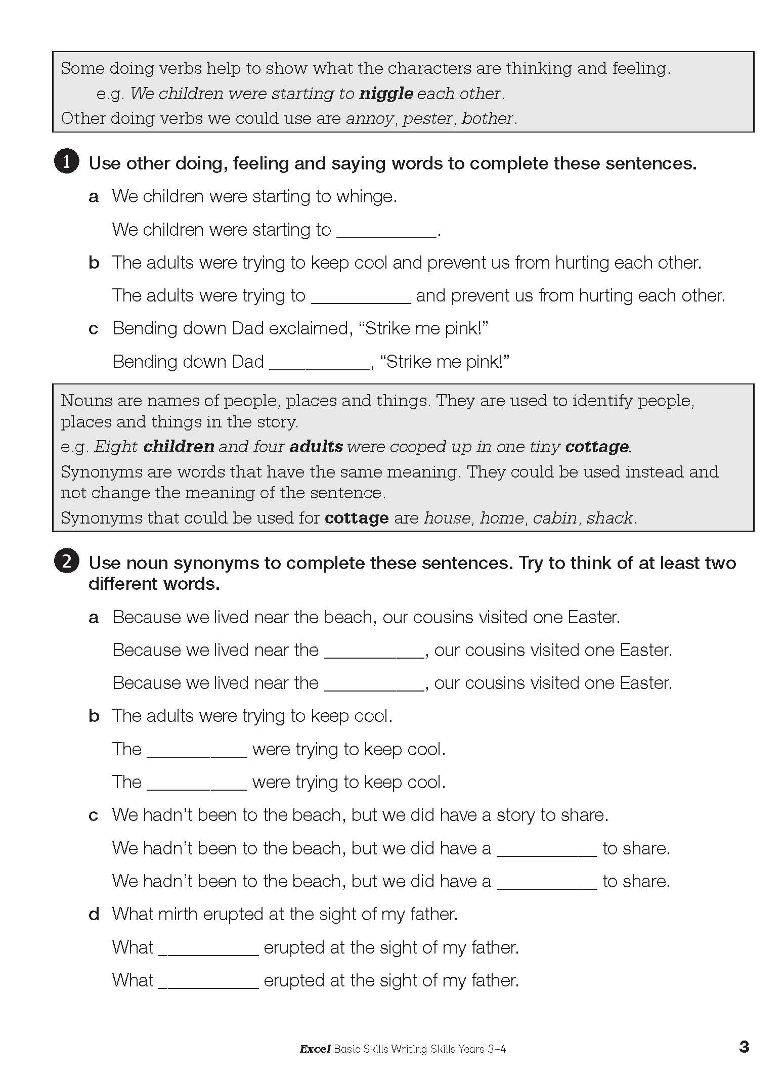 The Excel Basic Skills: Writing Skills book is designed to help Years 3-4 students develop and increase their creative writing skills. It is a clear and practical guide to writing well-structured, grammatically correct English. The book is divided into units based on various narrative and non-fiction text types. Each unit provides a model text, then a variety of practical exercises that cover the important grammar, vocabulary and punctuation points to be learned when writing for that specific text type. Answers are provided in a convenient lift-out section in the centre.