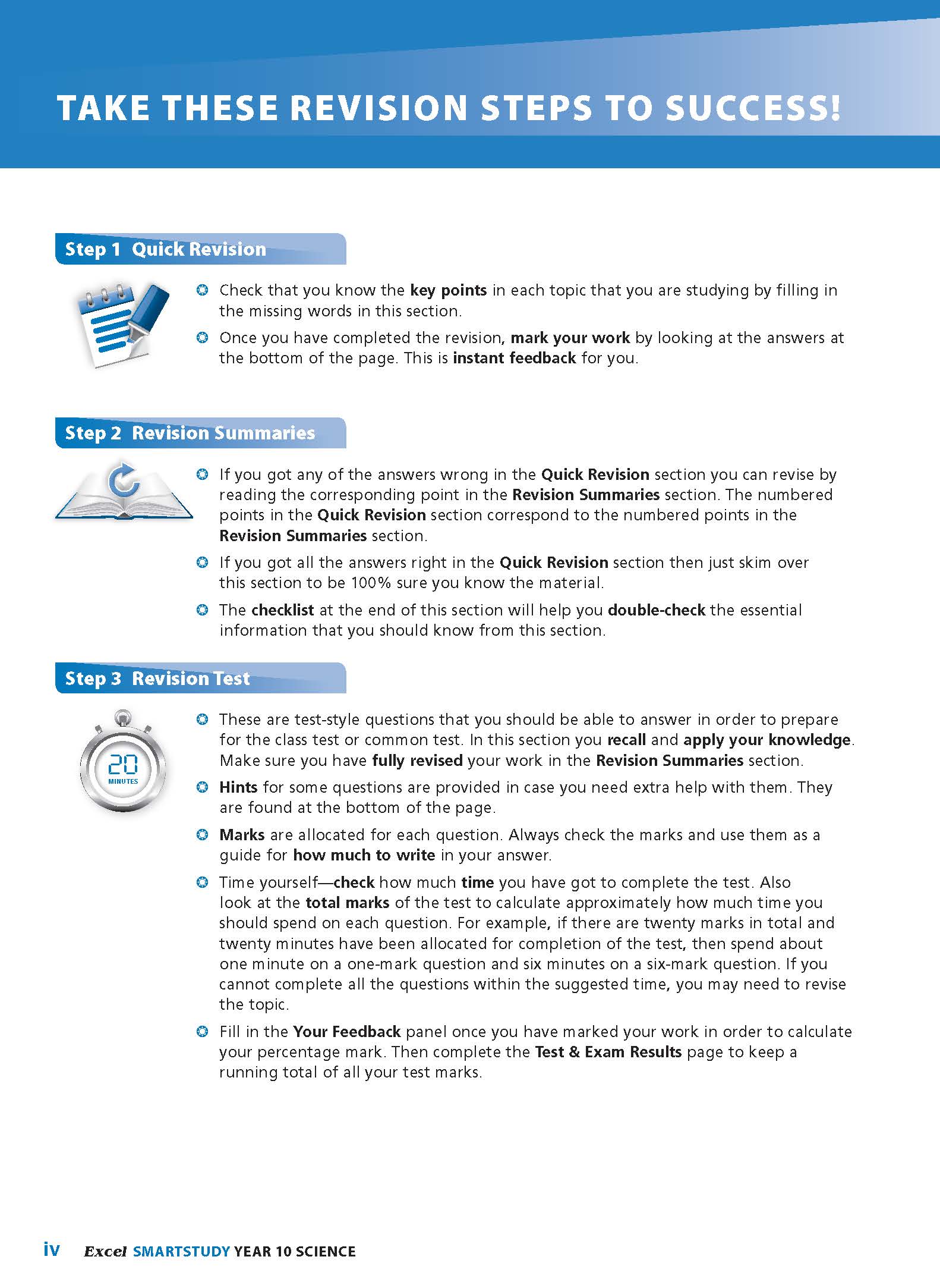 The Excel Smartstudy - Science Year 10 Book has been designed to help students revise for class tests, half-yearly and end-of-year exams. It is structured to consolidate students' understanding in line with the Australian Curriculum outcomes.