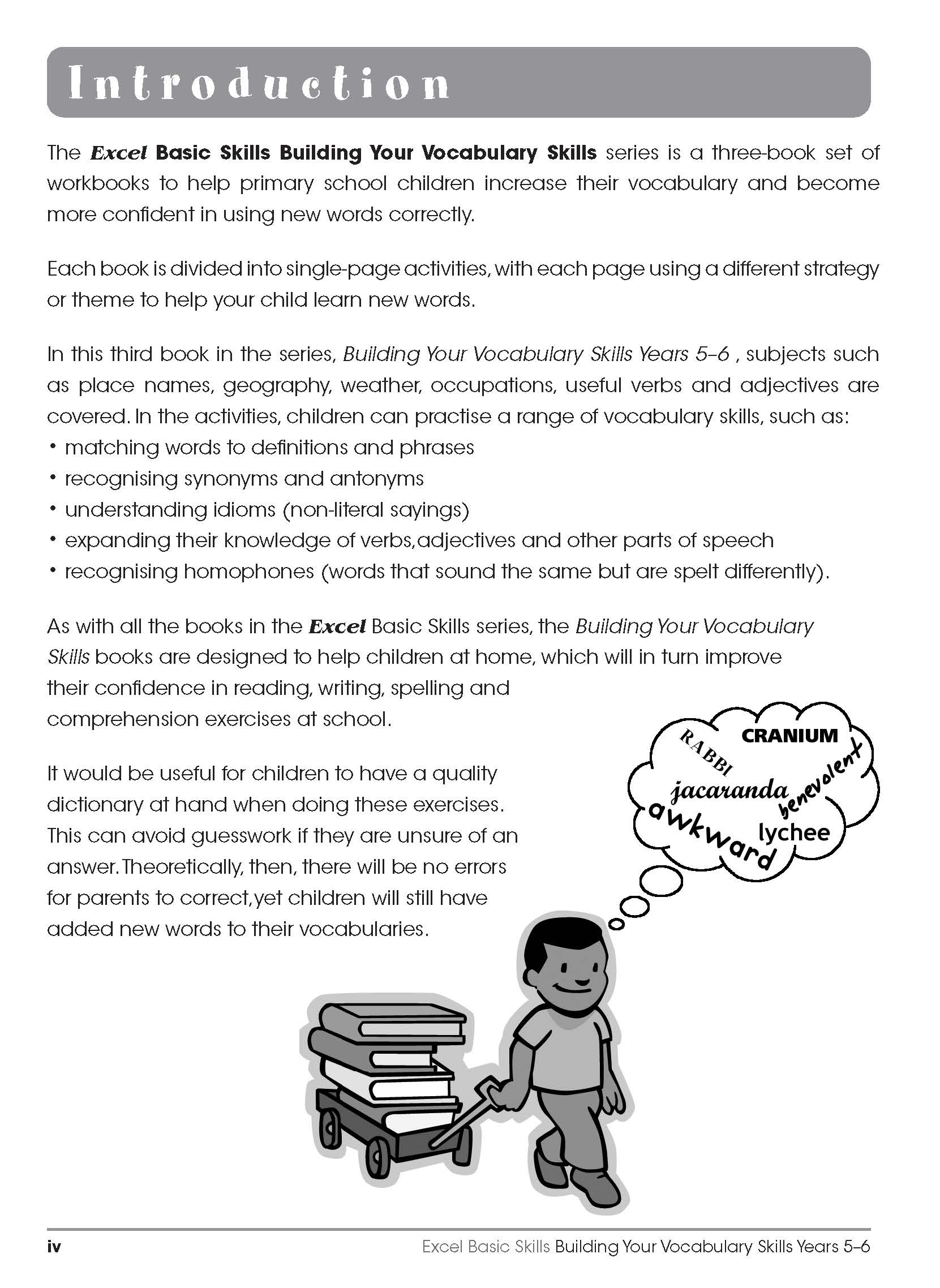 The Excel Basic Skills - Building Your Vocabulary Skills Year 5 - 6 Book covers subjects such as place names, geography, weather, occupations, and useful verbs and adjectives. Homophones, idioms, synonyms and antonyms are also covered.