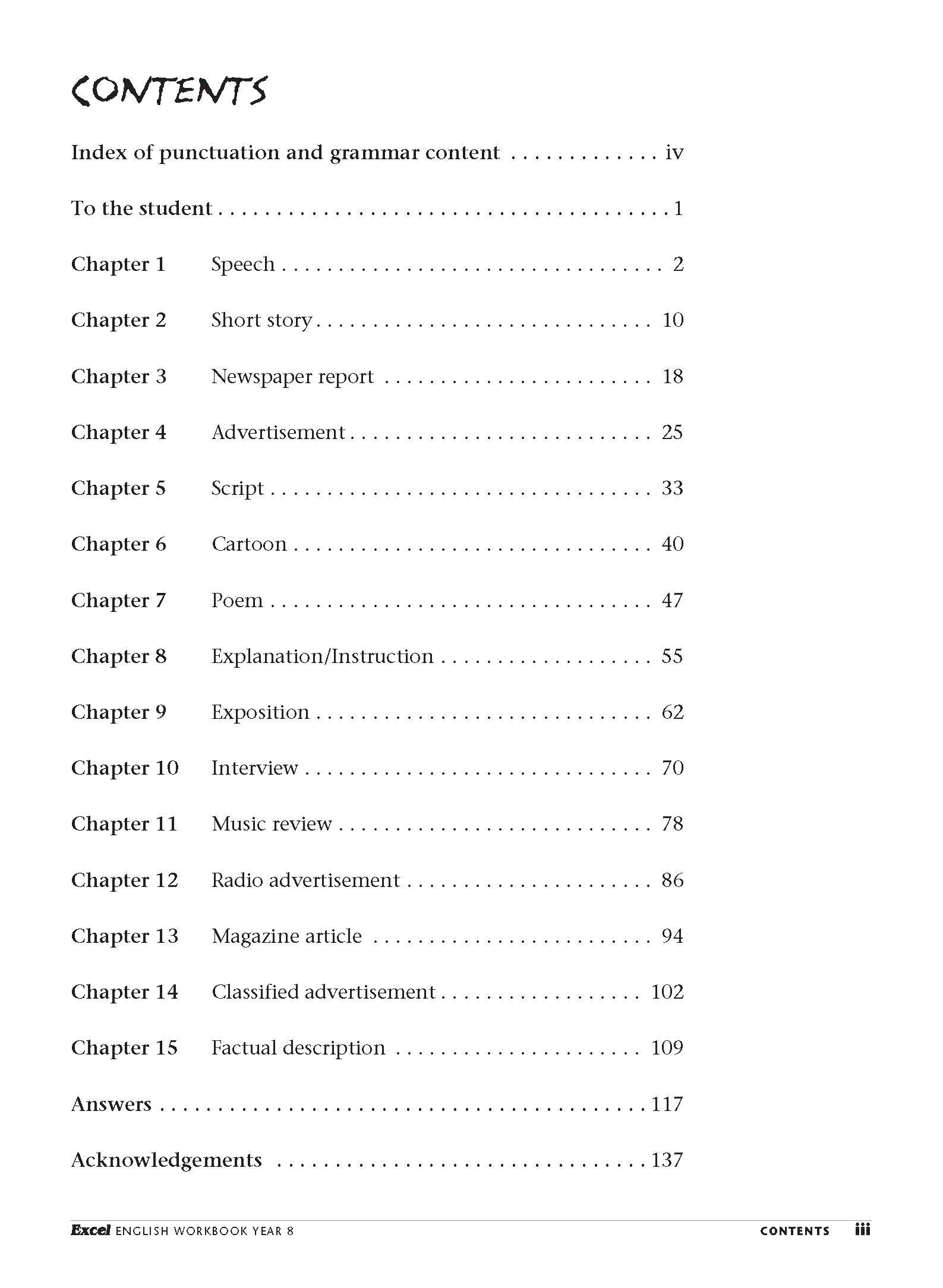 The Excel Essential Skills - English Workbook Year 8 aims to improve student's writing and give practical help with writing tasks. The topics and texts covered in the book are designed to help students in their writing tasks for all school subjects.
