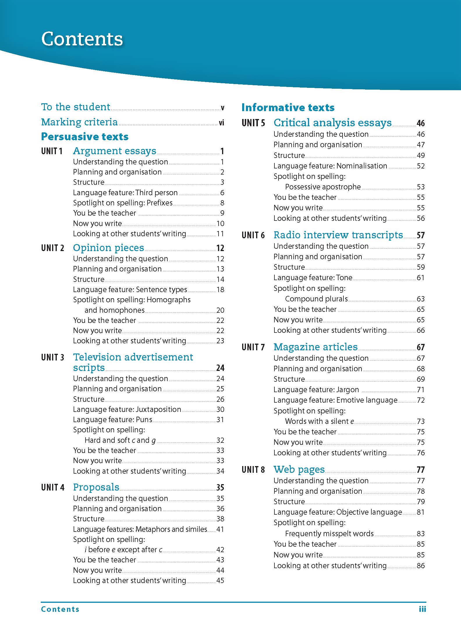 Students master the main language features and structures of the most common types of text. Each unit outlines the process of planning, drafting and writing a specific type of text, and then provides advanced and intermediate sample texts as benchmarks for students’ own writing.