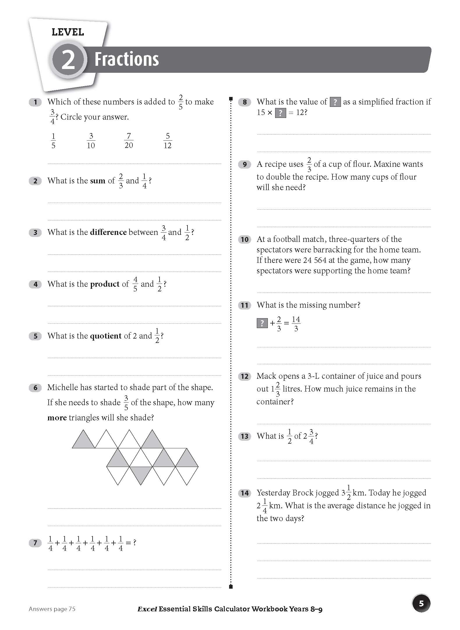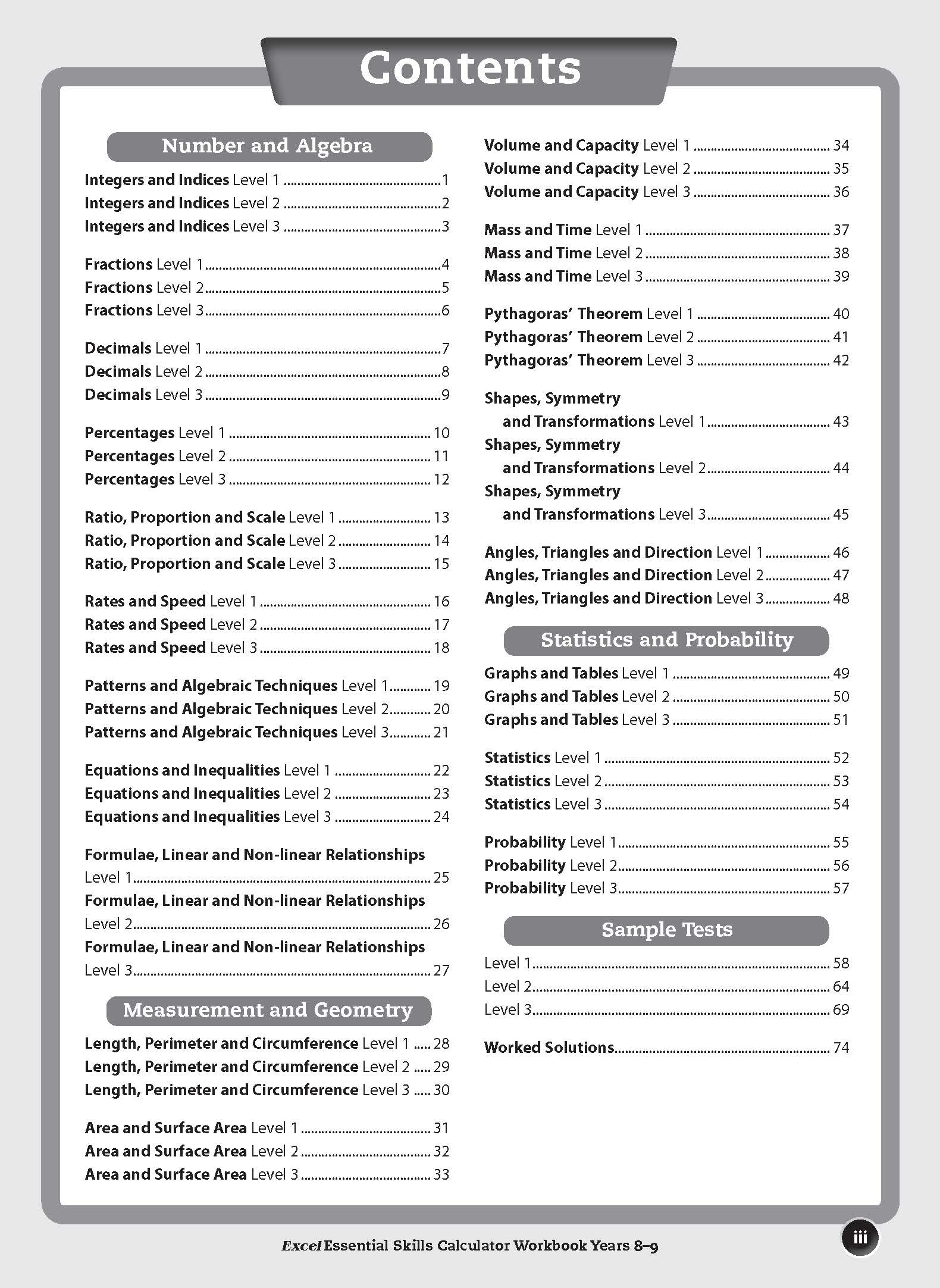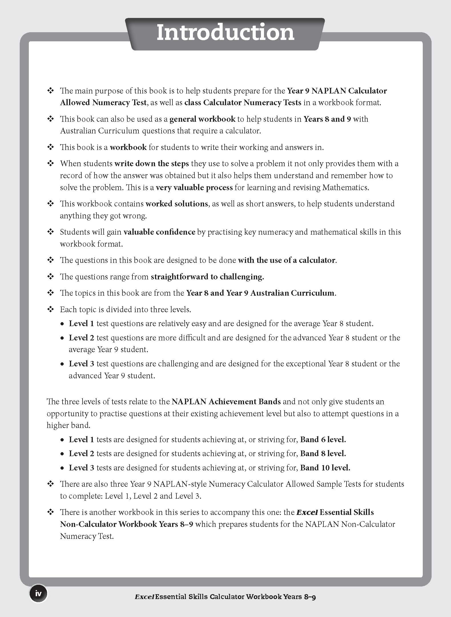 The Excel Essential Skills Calculator Workbook Years 8 - 9 has been specifically written for Year 8 and Year 9 Australian Curriculum Mathematics with a focus on improving numeracy skills. It features questions that will test students numerical, algebraic, spatial, graphical and statistical concepts and skills. Questions are designed to be completed with the use of a calculator and will provide pportunities for skills development in the topics of fractions, decimals, percentages and integers. The book is divided into units of work from the Number and Algebra, Measurement and Geometry, and Statistics and Probability strands.