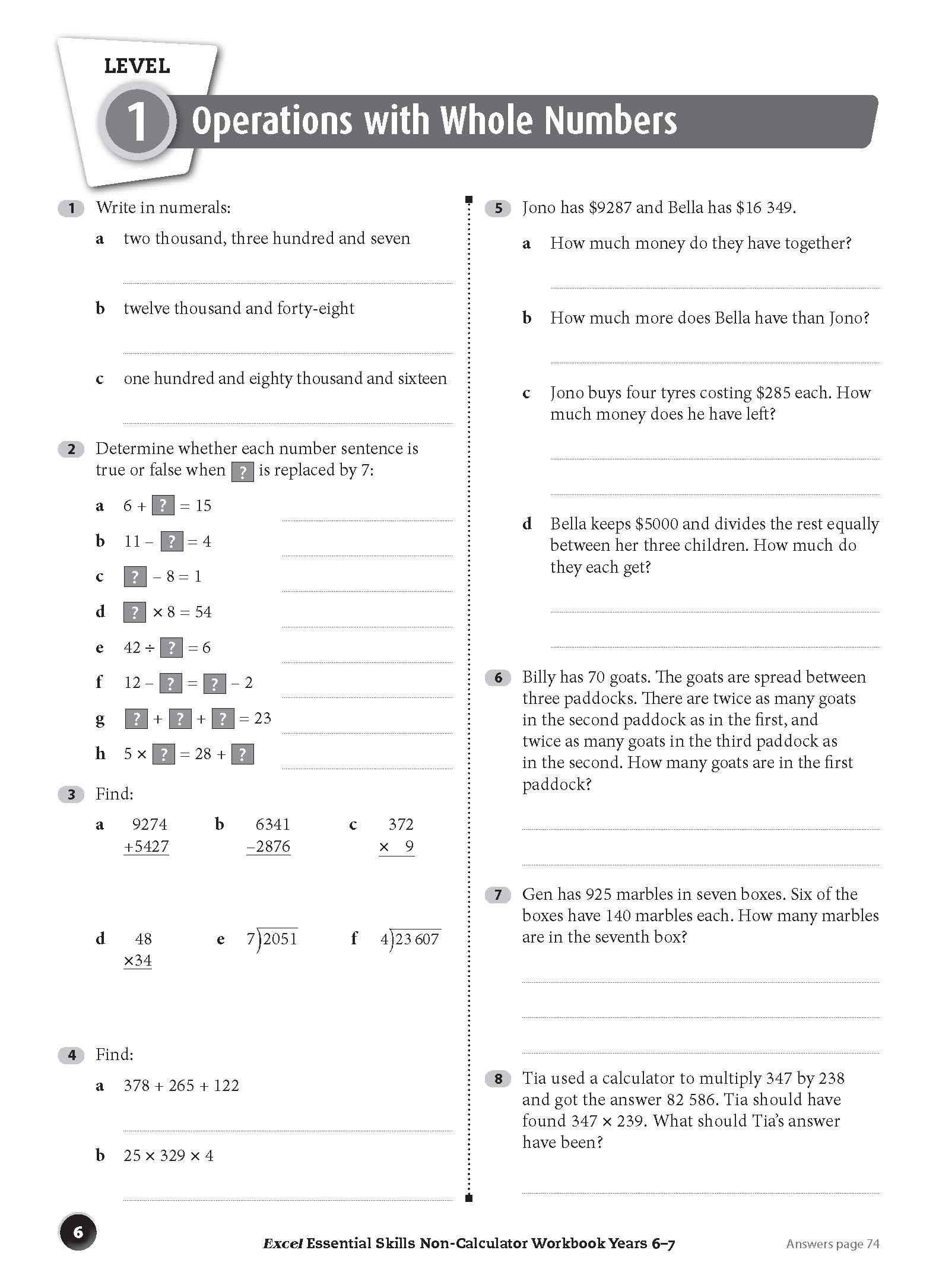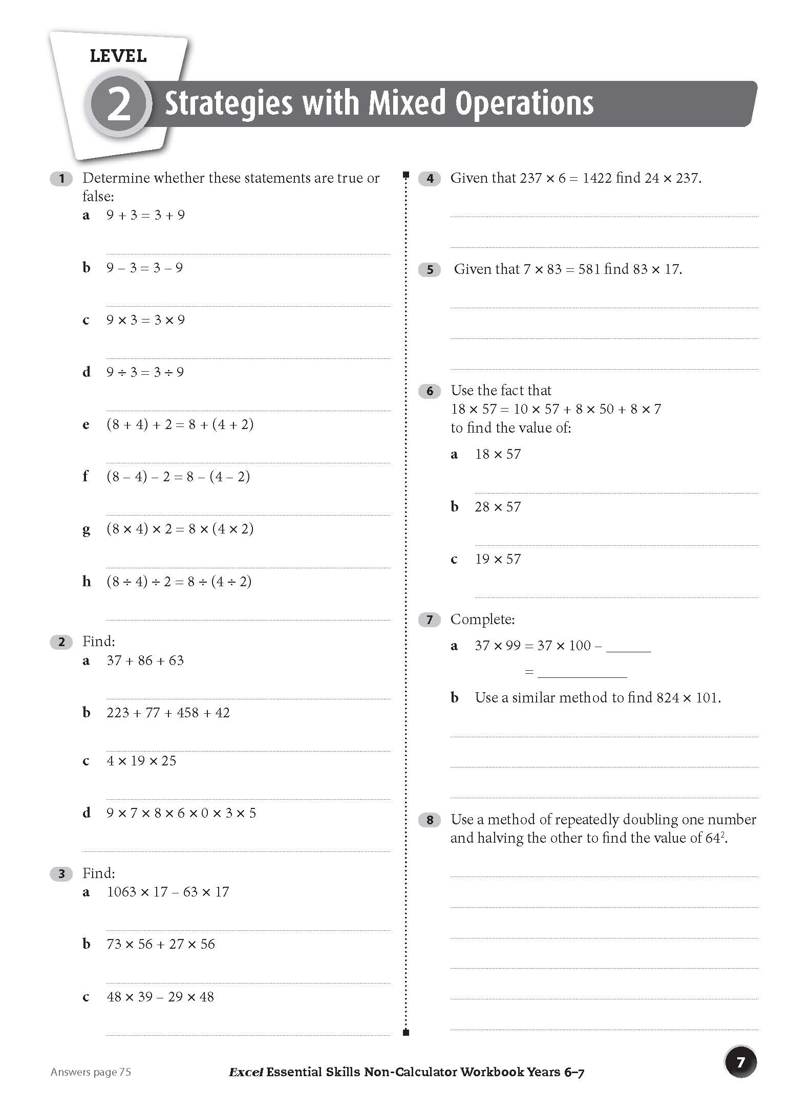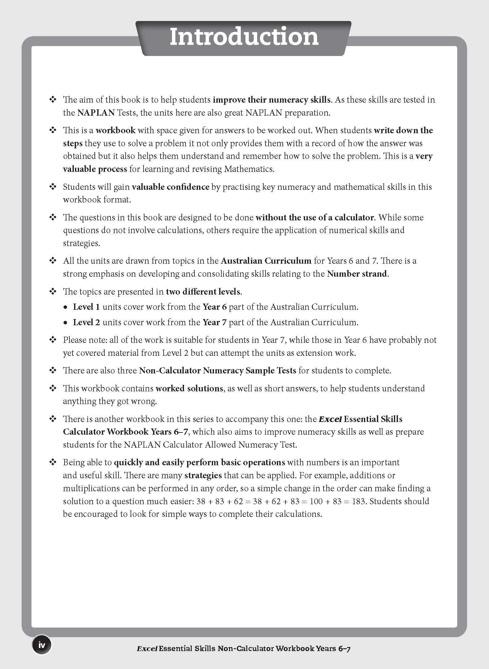 The Excel Essential Skills Non-Calculator Workbook Years 6–7 has been specifically written for the Year 6 and Year 7 Australian Curriculum courses with a focus on improving numeracy skills. It features questions that a student should be able to answer without the use of a calculator in topics such as addition, subtraction, multiplication, division, fractions, decimals and percentages. The book will also encourage the application of strategies from these topics in questions from the following strands of the syllabus: Measurement and Geometry, and Statistics and Probability.