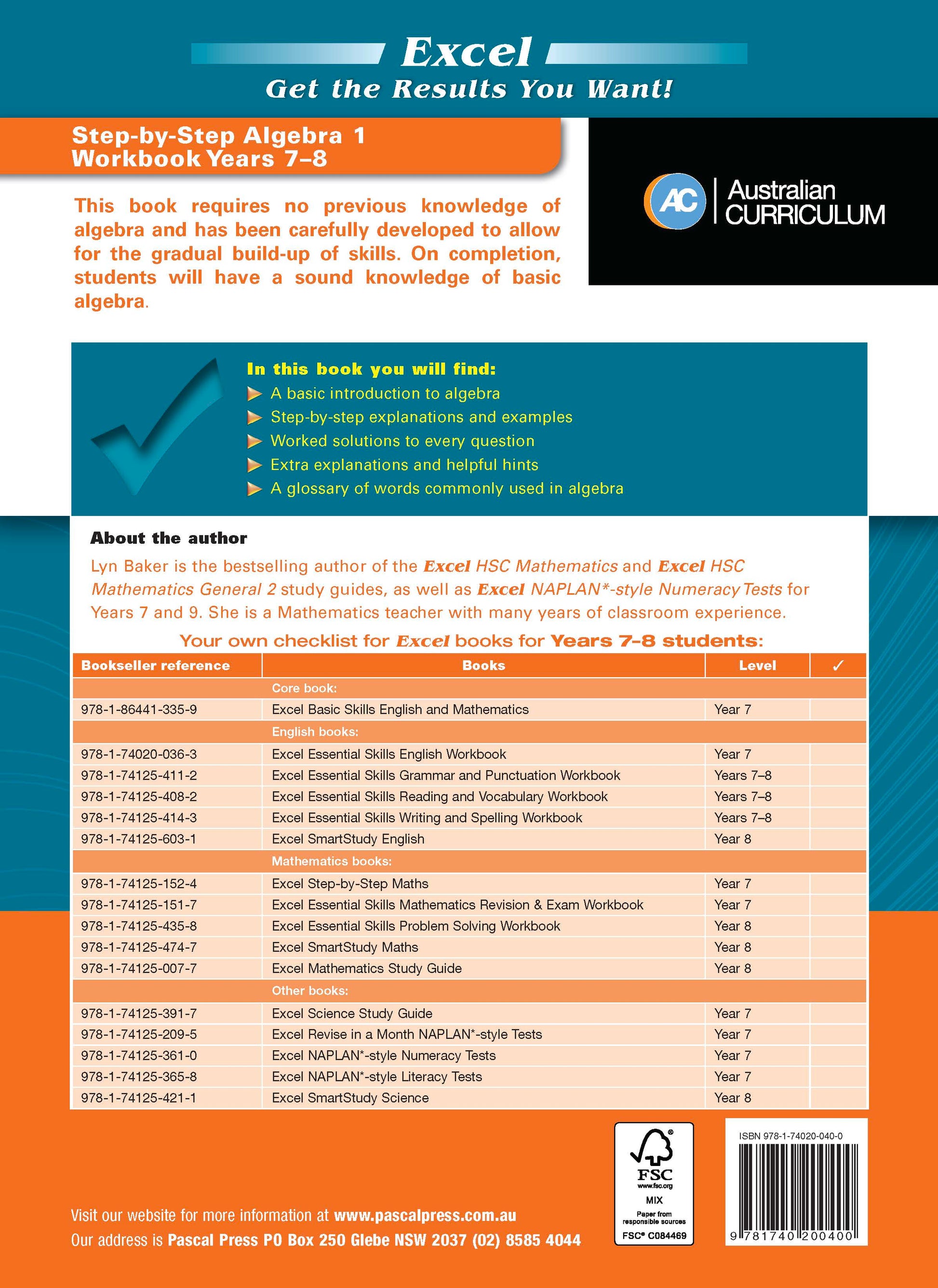 In Excel Step By Step Algebra 1 Workbook Years 7-8 you will find: