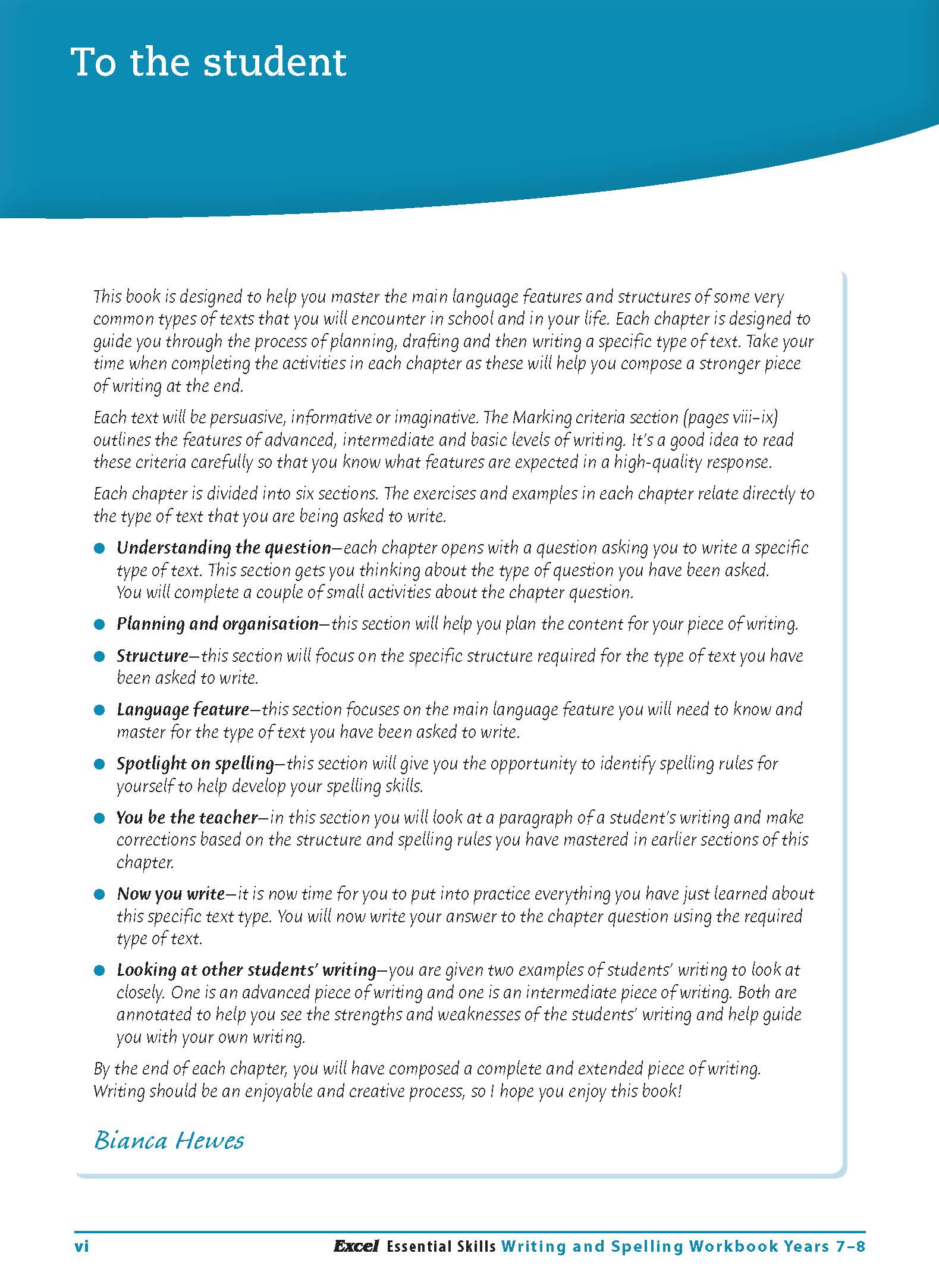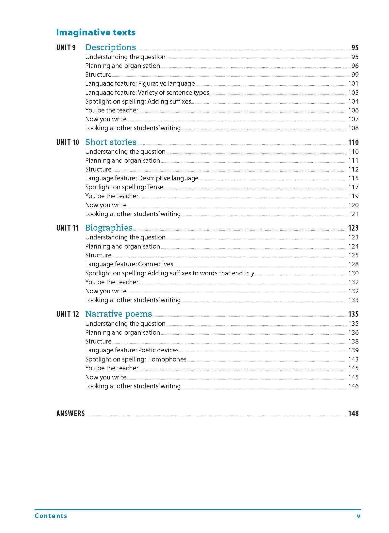 Specifically written for the Australian Curriculum English course, this book will help students master the main language features and structures of the most common types of text for Years 7–8. Each unit outlines the process of planning, drafting and writing a specific type of text, and then provides advanced and intermediate sample texts as benchmarks for students’ own writing.