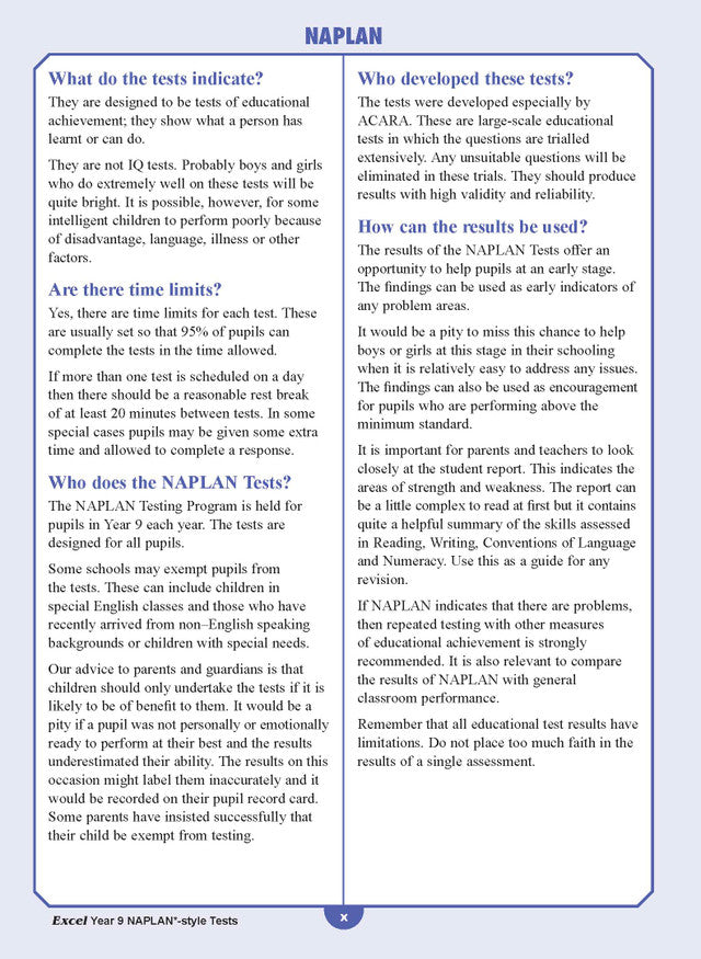 The Excel Year 9 NAPLAN*-style Test Book is designed for parents who want to help their children succeed in the NAPLAN test for Year 9 students. This book is great for general revision and offers five practice tests for each section of reading, numeracy, language conventions and writing.