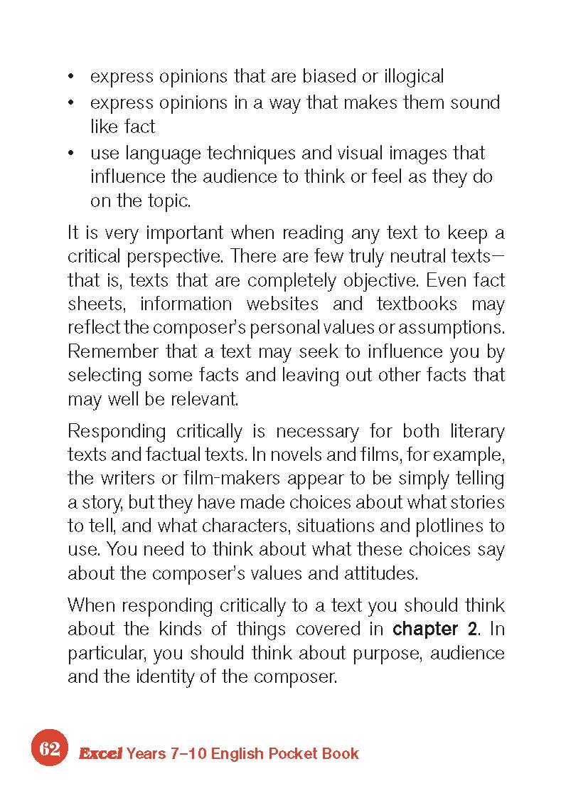 Excel Pocket Books provide a quick and easy reference tool to give you the edge at school. The English Years 7-10 book is ideal as a reference book, with an index included to help you find what you want. The first 4 chapters cover the fundamental English and textual concepts, with the following chapters being more topic or text-type specific. There is also a writing guide covering the major text types, as well as clear explanations of fundamental principles relating to grammar, punctuation and spelling.