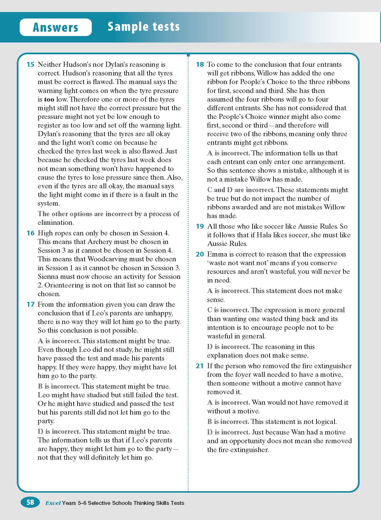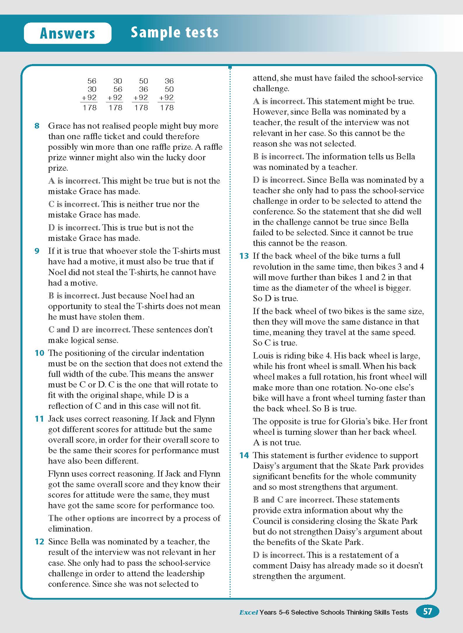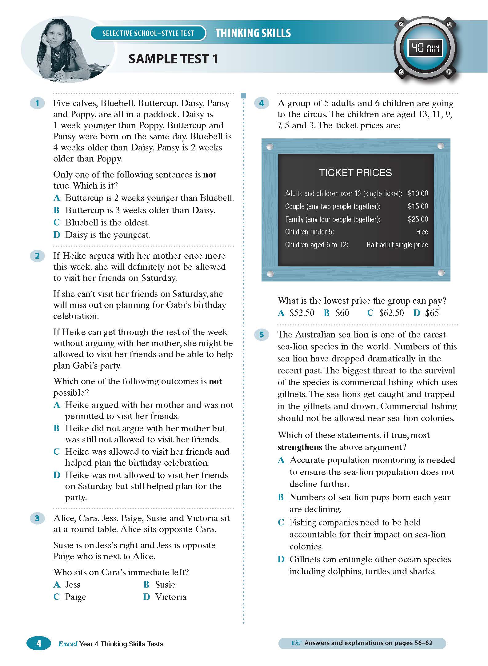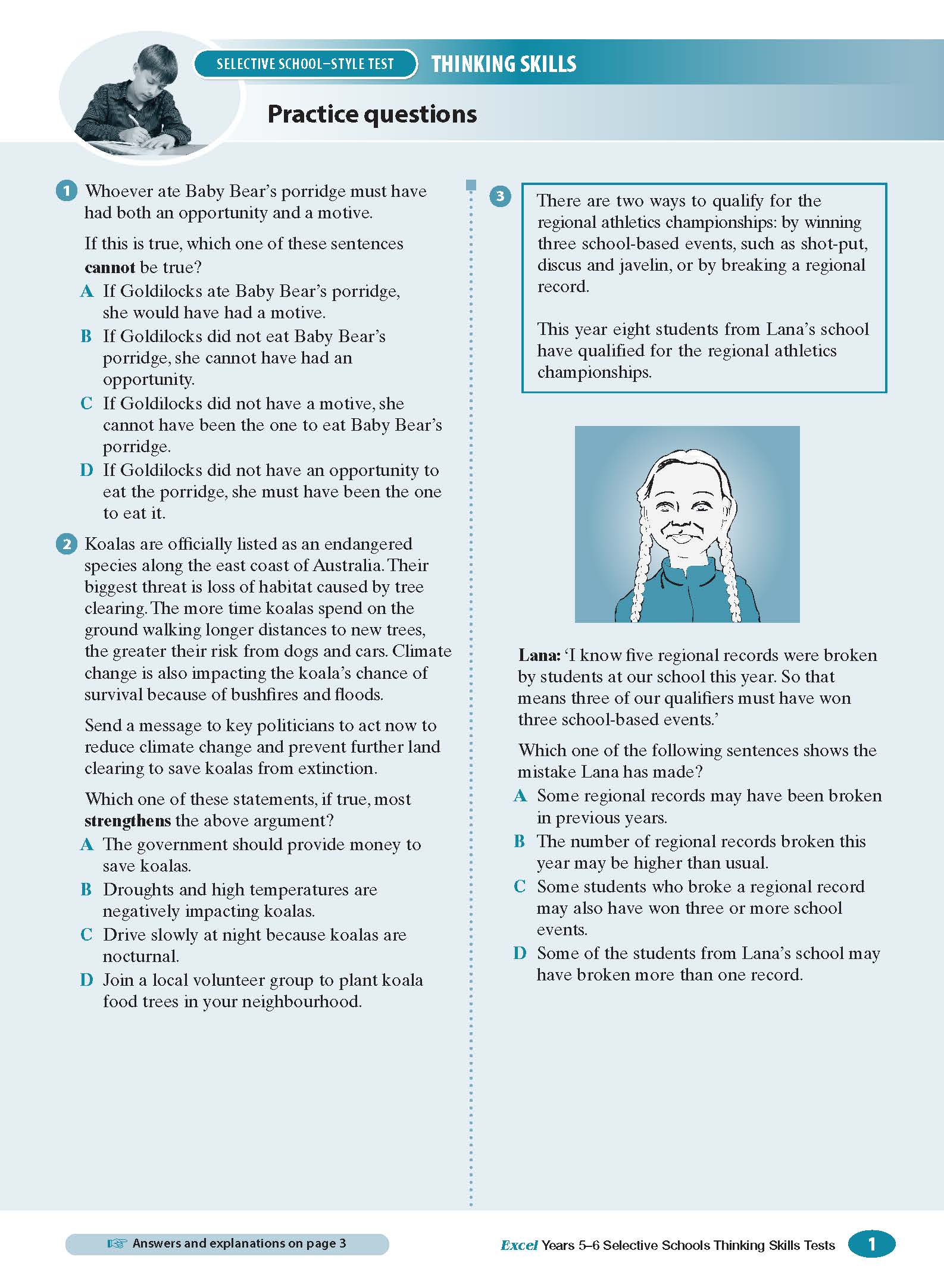 Excel Selective Schools Thinking Skills Tests Years 5-6 is a comprehensive study guide for the Thinking Skills part of the Selective Schools and Scholarship Tests. This title includes practice questions with helpful hints on tackling Thinking Skills questions
