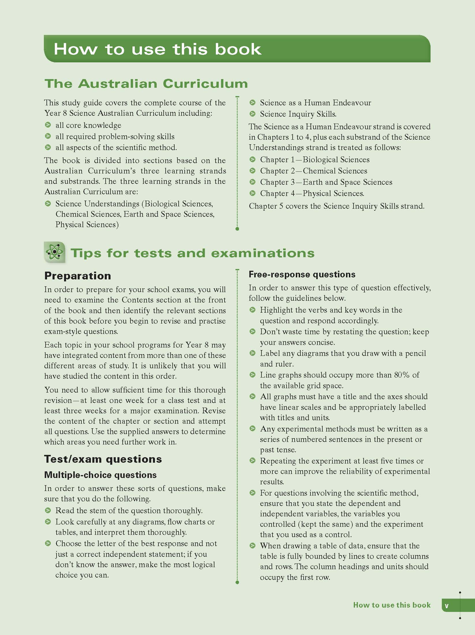 This book is specifically written for the Year 8 Australian Curriculum Science Course. The three topics (strands) covered are: Science as a Human Endeavour, Science Inquiry Skills and Science Understanding.