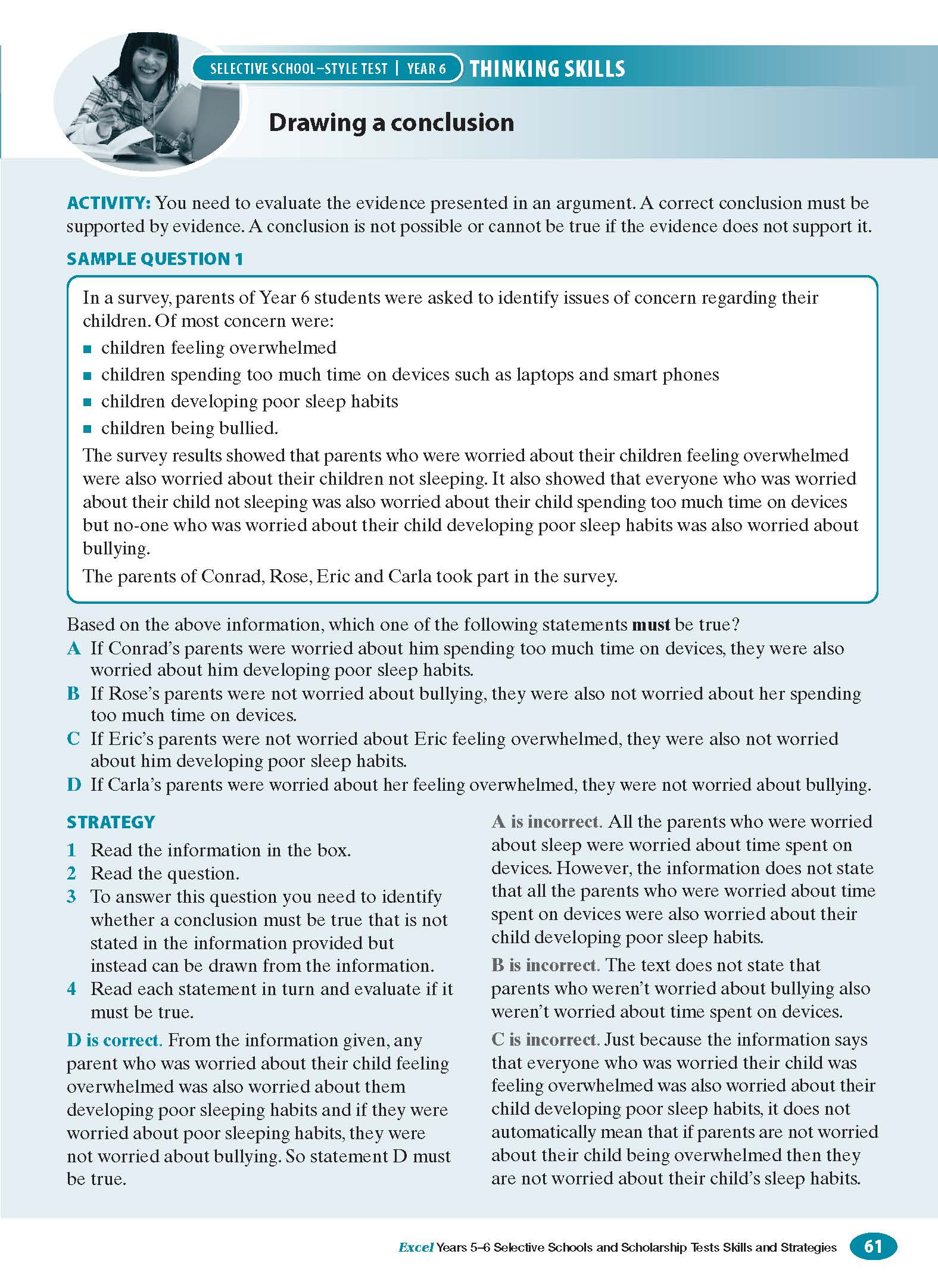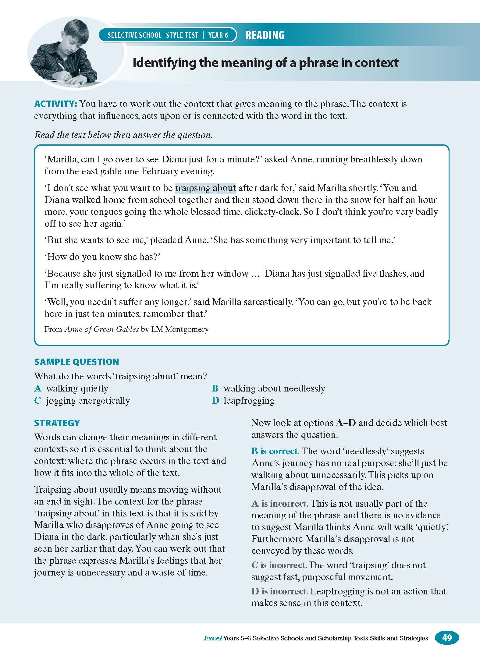 The aim of Excel Test Skills - Selective Schools & Scholarship Tests Skills & Strategies Years 5-6 is to identify, develop and practise the skills useful in test situations, in particular the Selective Schools and Scholarship Tests. Recognition of these skills and strategies, and confidence in applying them, will lead to better test results.