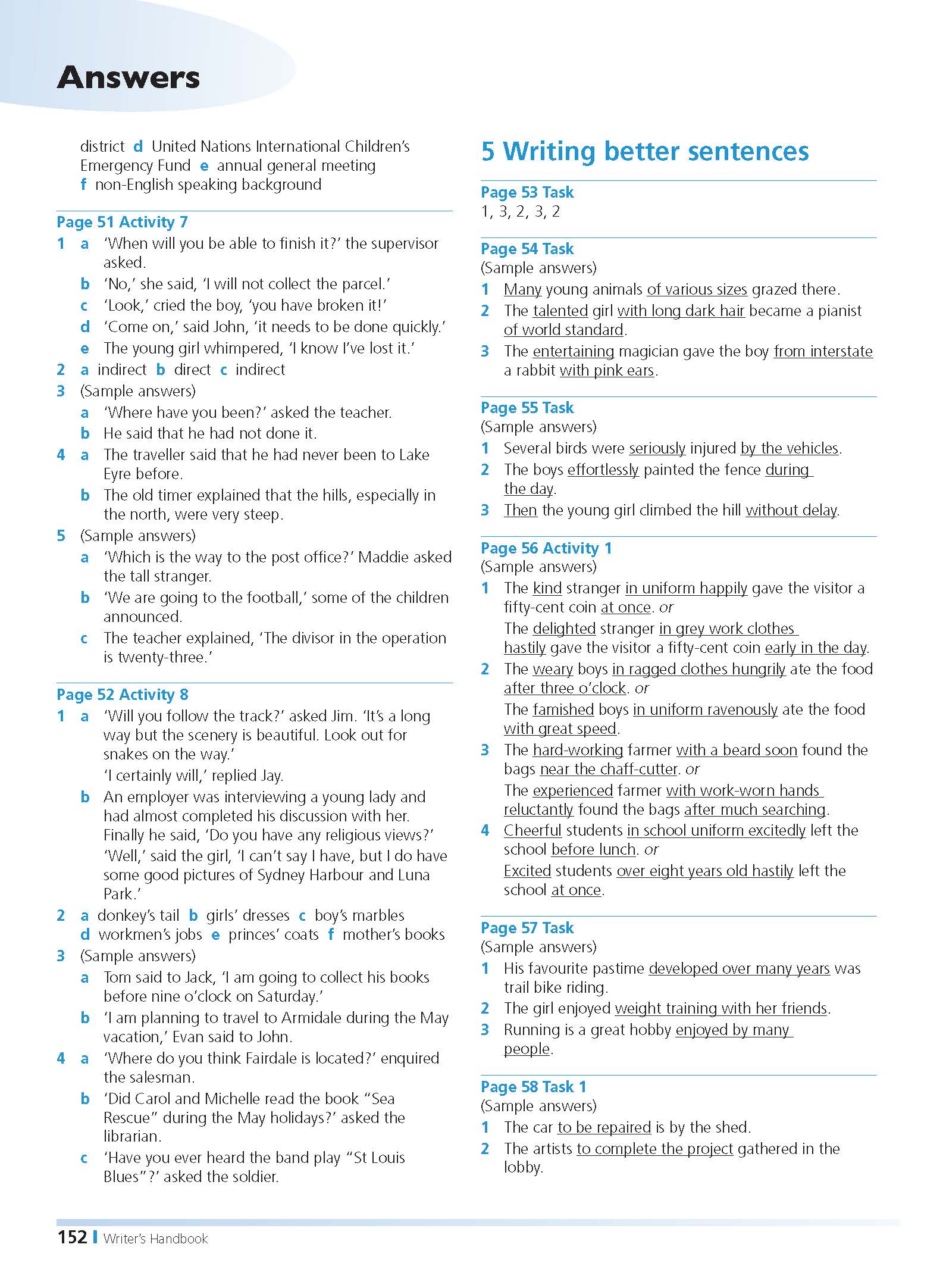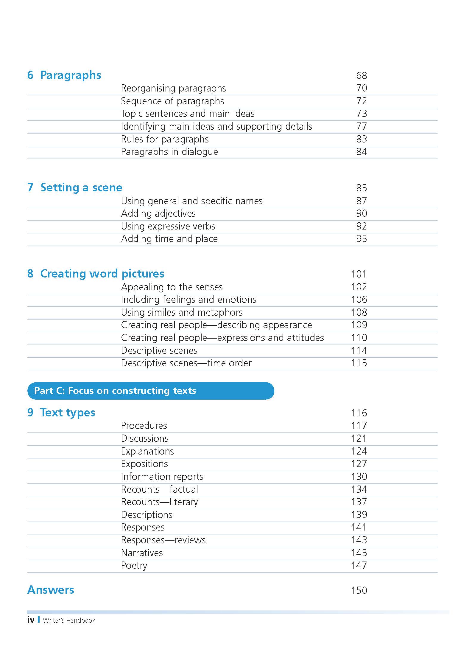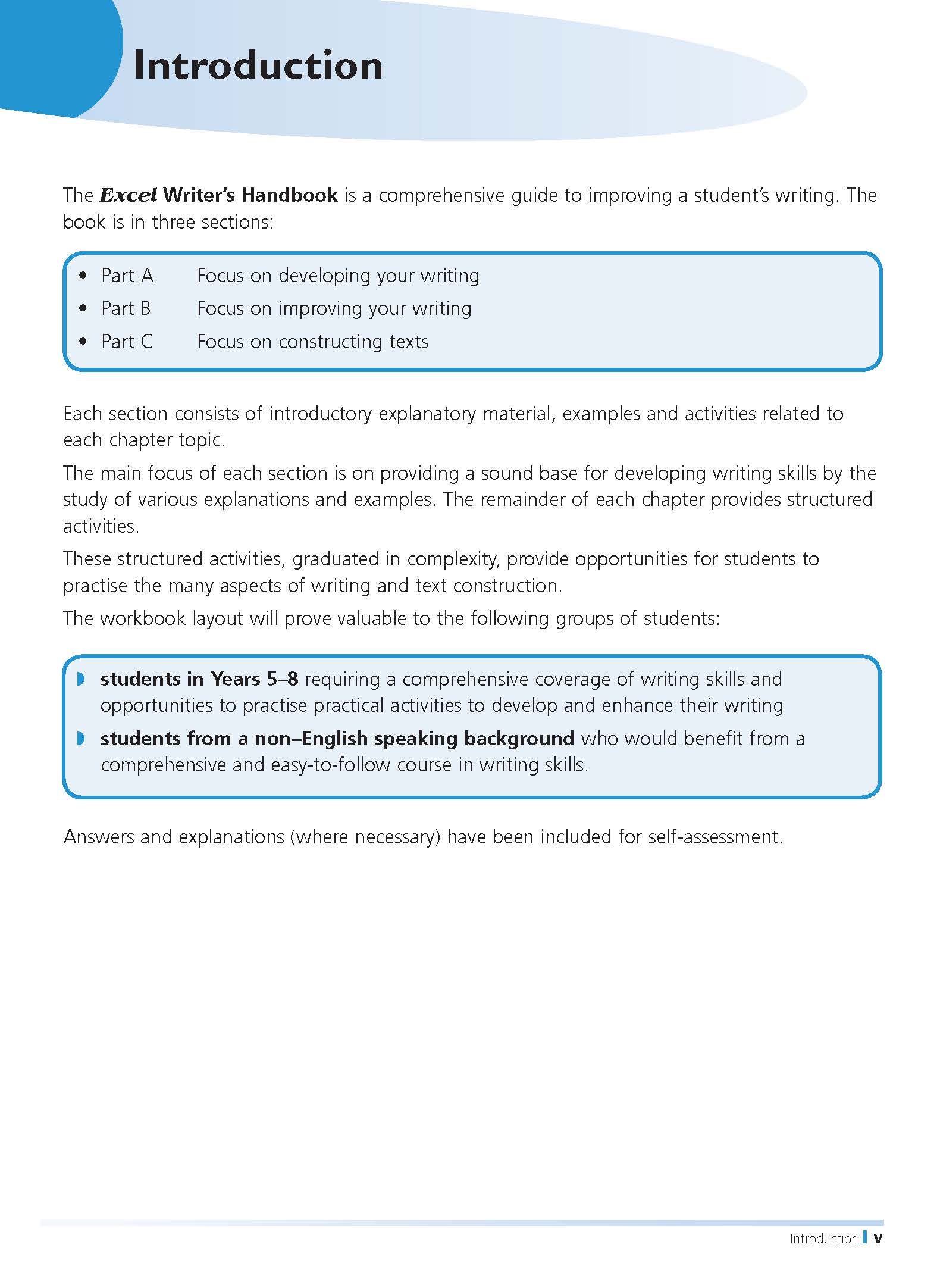 The main focus of each section is on providing a sound base for developing writing skills by the study of various explanations and examples. The remainder of each chapter provides structured activities. These structured activities, graduated in complexity, provide opportunities for students to practise the many aspects of writing and construction.